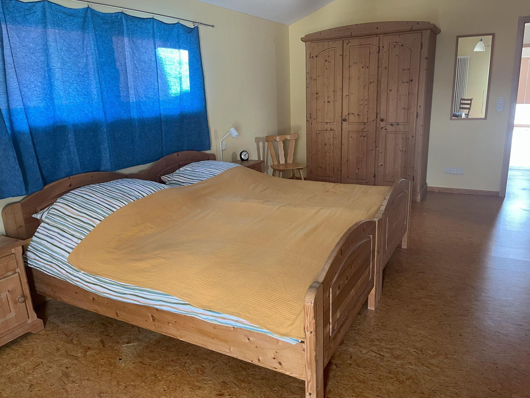 Das sehr große Schlafzimmer hat zwei Betten, ebenfalls einen Fernseher. Ein Gitterbett für Babys ist vorhanden. Ein großer Kleiderschrank, eine Kommode und zwei Nachttische mit Lampen bieten Komfort und Platz für Kleider und Utensilien.