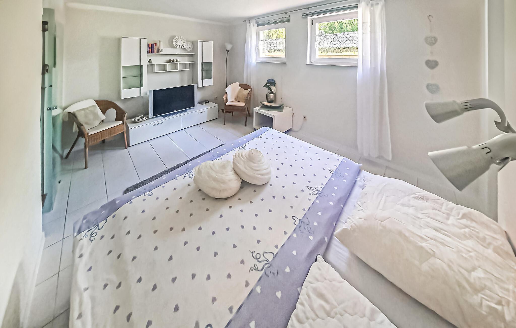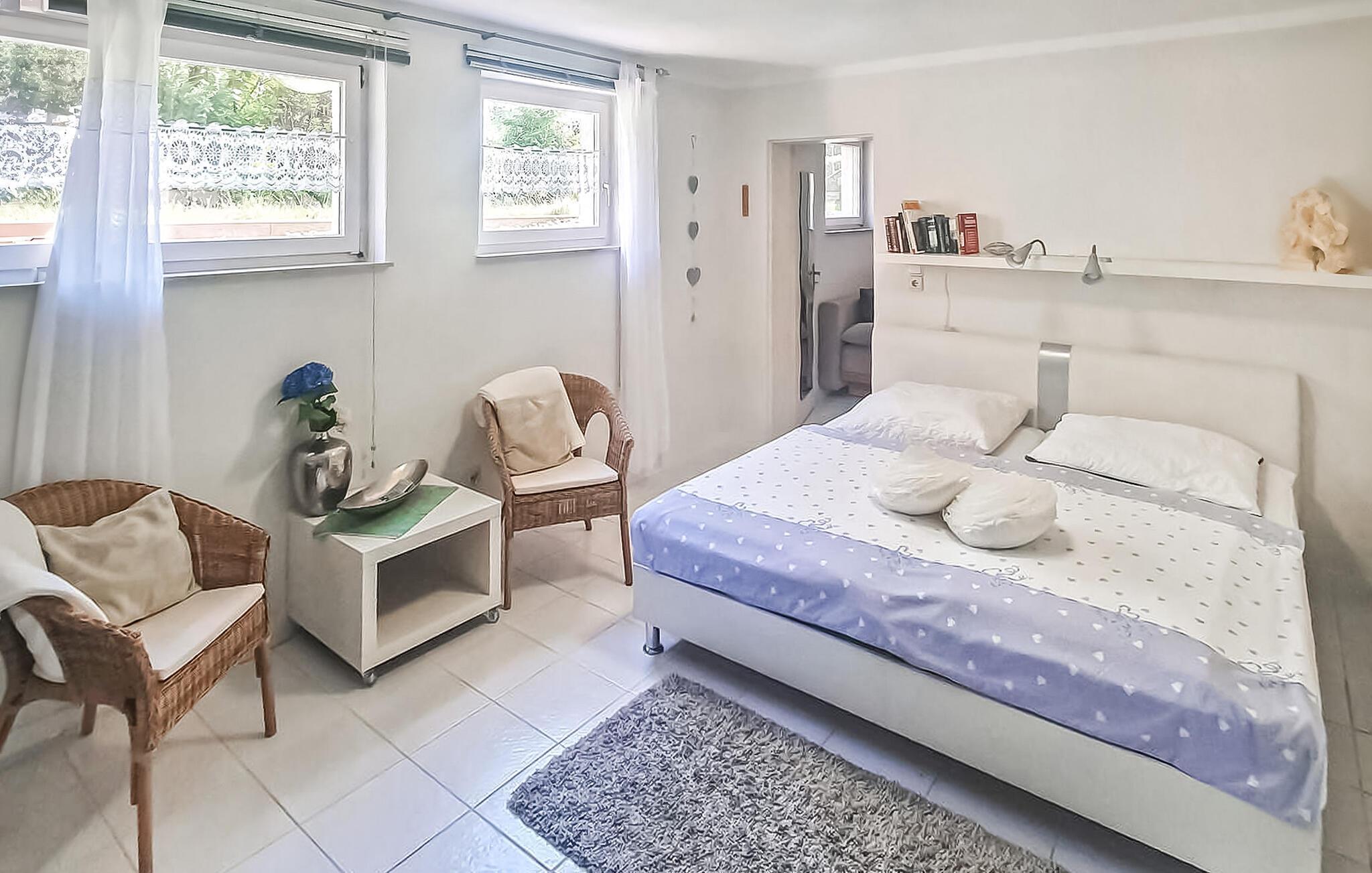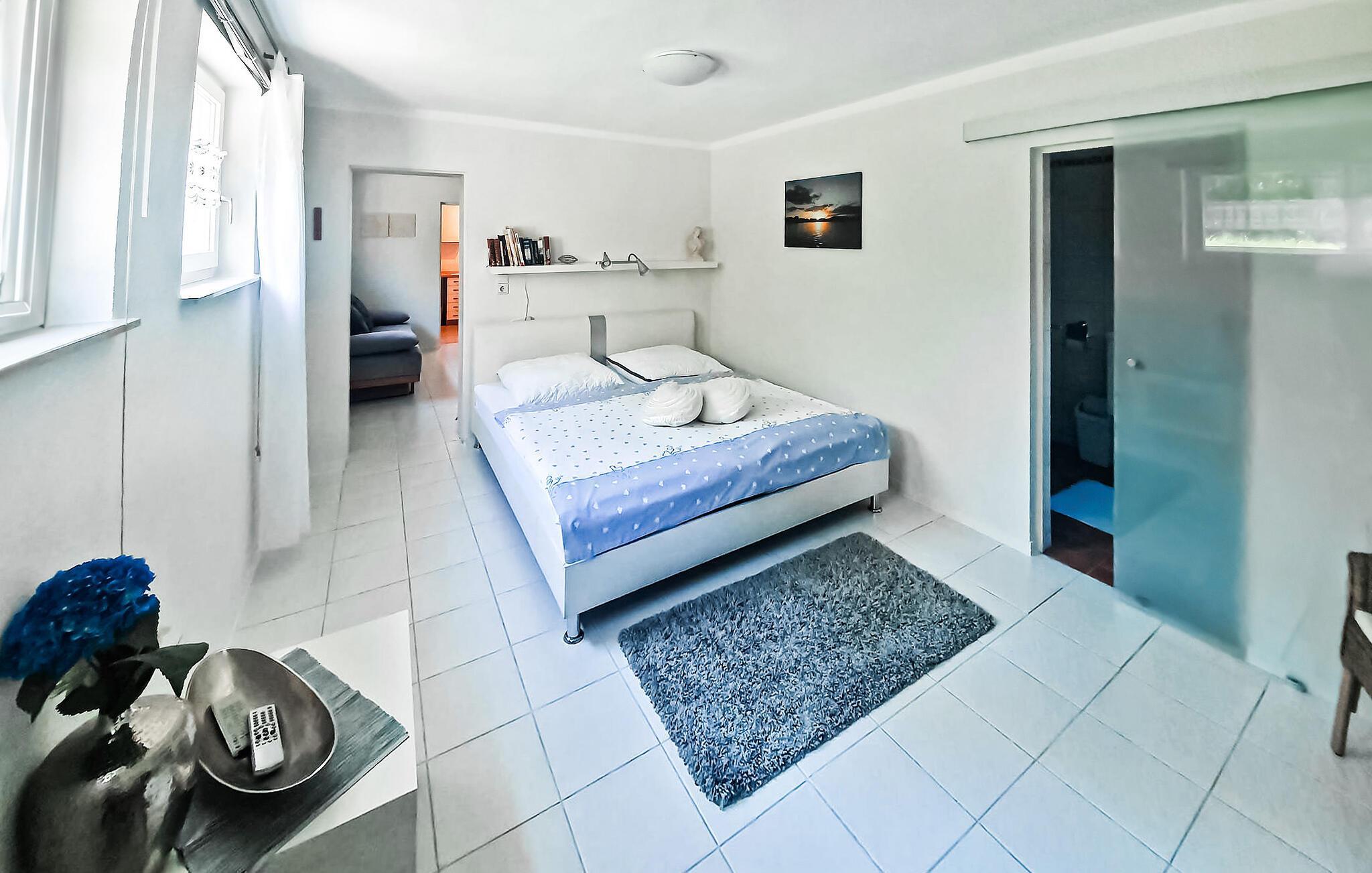 Semesterlägenheten med separat ingång ligger i källaren i ett bostadshus på ägarens 1500 kvadratmeter stora bostadsfastighet. Det lilla bostadsområdet ligger i utkanten av ett naturreservat, bara ca 300 meter från en badplats vid sjön Plau. Lägenheten, som senast renoverades 2020, är utrustad med ett kombinerat vardagsrum/sovrum (dubbelsäng, liten sittgrupp, TV, radio), ett litet genomgångsrum (bäddsoffa, extra möjlighet till barnsäng), ett helt nyutrustat kök (elspis med ugn, diskmaskin, kylskåp, mikrovågsugn, matplats, diverse små köksmaskiner) och ett badrum (dusch/WC med golvvärme). Det finns också en möblerad uteservering med solstolar, grill- och lägereldsplats, solbadplats och parkeringsplats samt mot avgift bastu (från 01.04.) och W-LAN. I totalpriset ingår vatten, energi och slutstädning. Sänglinne och handdukar kan tas med eller hyras. Betalas på plats: Tvättpaket (om så önskas), W-LAN 8 EUR.