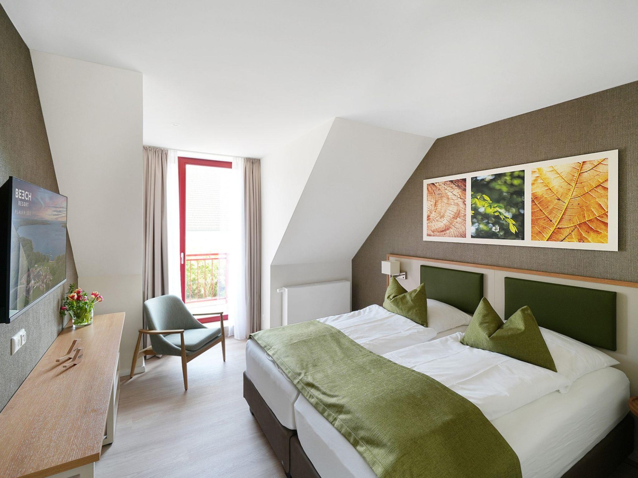 Modern, comfortable resort "Beech Resort Plauer See", renovated in 2024, surrounded by trees and meadows. 72 apartments in the residence. 1 km from the centre of Ganzlin, on the outskirts, 8 km from the centre of Plau am See, in a quiet position, 50 m from the edge of the forest, 50 m from the lake, 50 m from the beach, direct access to the beach, in the countryside. For shared use: natural state property 9 ha, garden with lawn and trees, lawn for sunbathing. Nat. Swimm. Pond, volleyball, children's playground (swing). In the complex: reception, restaurant, bar, bistro with TV, sauna, fitness room, massage (extra). Relaxation room, table tennis, table football, sun terrace, central heating system, washing machine (extra), tumble dryer (for shared use, extra), bicycle rental. Available: boat (extra). Linen change (suppl. charge extra). Towel change (suppl. charge extra). Breakfast and half board possible on request (extra). Parking on the premises. Shop 8 km, supermarket 8 km, bakery 8 km, bus stop "Plau am See" 3 km, sandy beach 50 m, bathing lake "Plauer See" 50 m. Sports harbour 5 km, golf course (73 hole) 28 km, tennis 28 km, riding stable 11 km, walking paths from the house 300 m, children's playground 50 m. Nearby attractions: Plau am See 8 km, Malchow 25 km. Well-known lakes can easily be reached: Plauer See 50 m, Müritz See 30 km. Please note: car-free holiday complex, car recommended, no lift. Baby equipment on request (extra). Fishing [permit required].