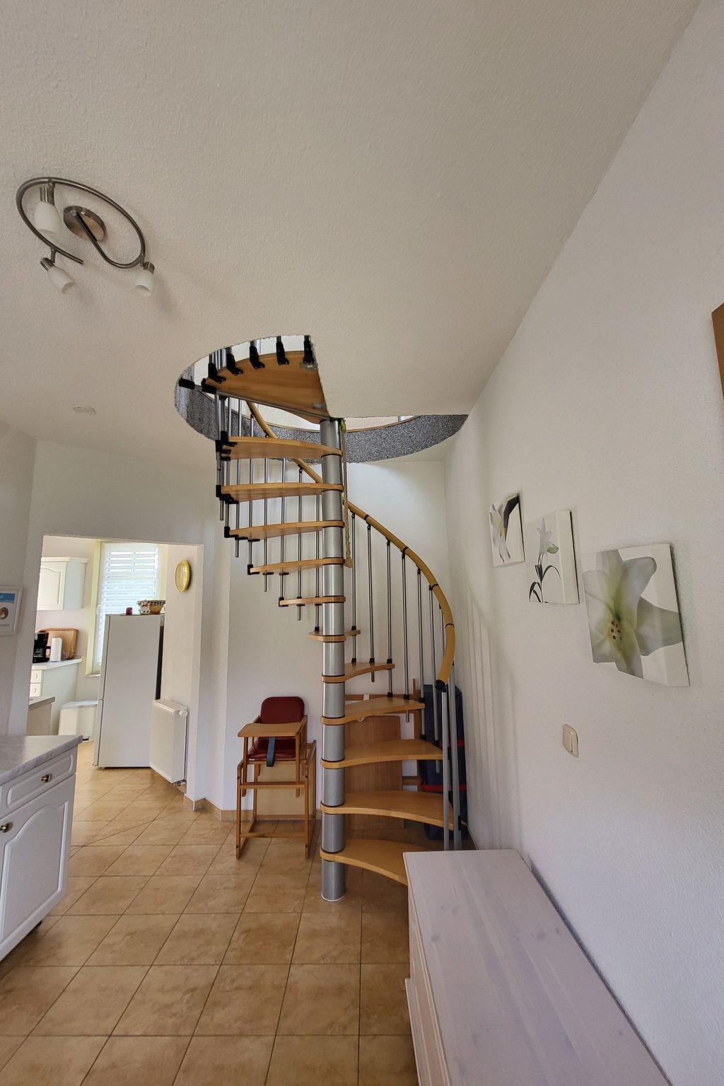 The bedroom is located on the upper floor (1 bed + 1 bed + 1 double bed). There is also a shower/WC on the upper floor. The upper floor can be reached via a spiral staircase. In the outdoor area of the property you can use two terraces, one of which faces the lake. You also have the option of using the garden benches in the garden facing the lake and enjoying the marvellous view over the lake.