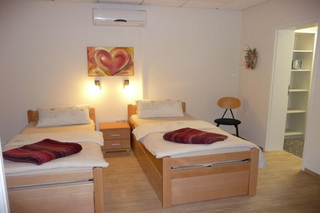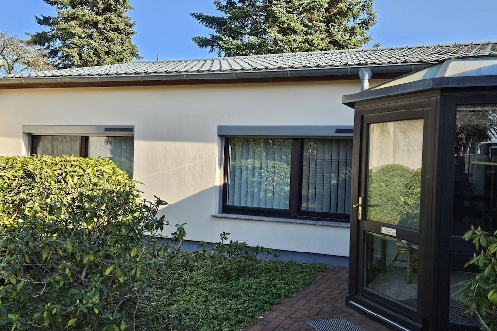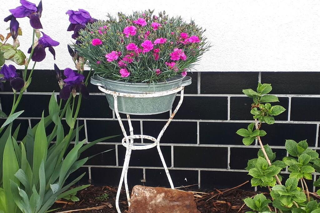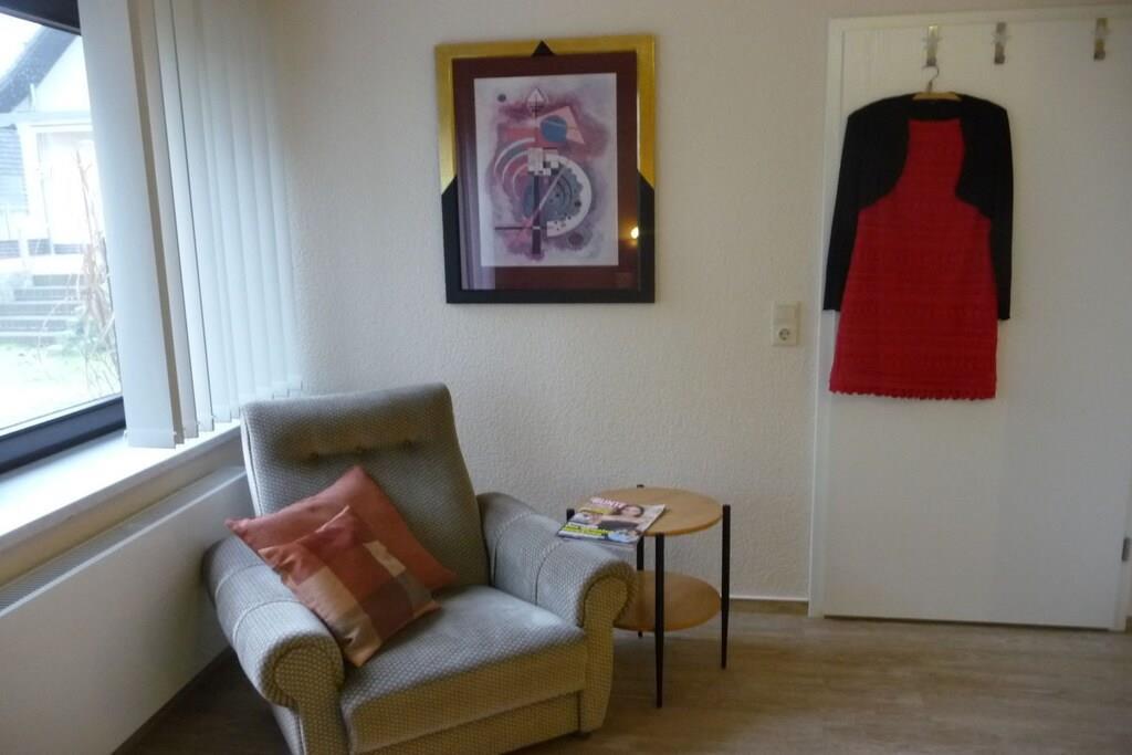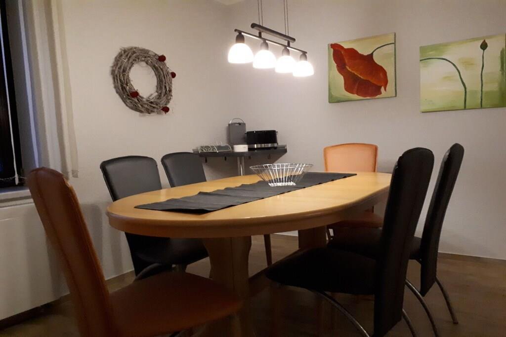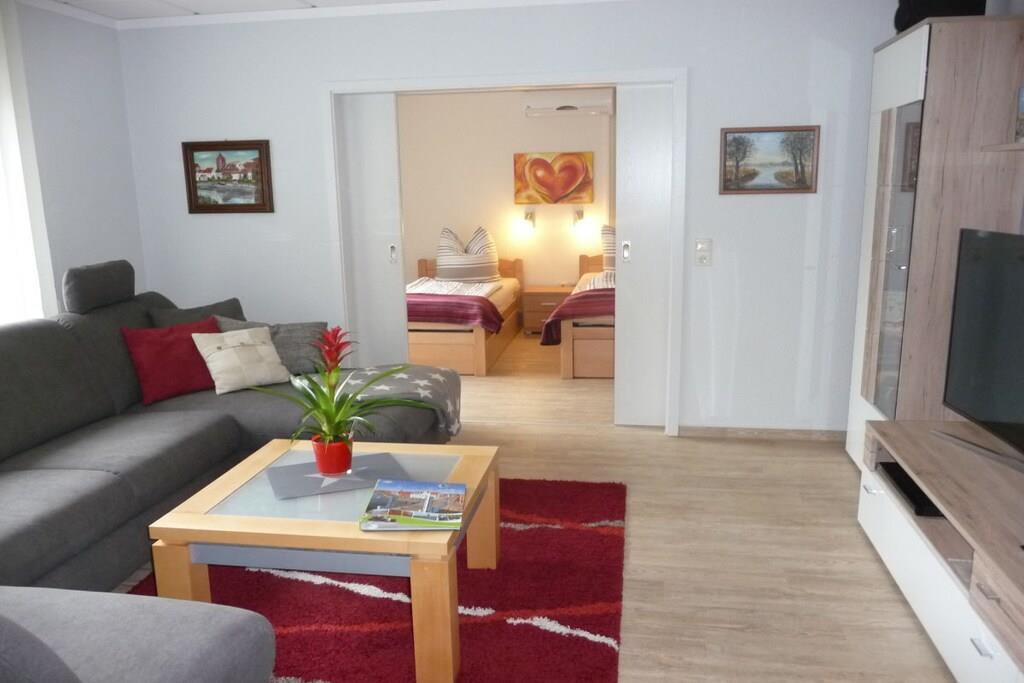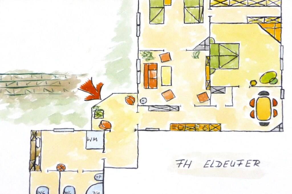 Das geräumige und komfortable Ferienhaus befindet sich auf unserem großzügigen Grundstück, angrenzend an eine Obstwiese. Sie gehen von Ihrem eigenen Parkplatz einige Stufen hinunter in den romantischen Innenhof - so gelangen Sie zum Eingangsbereich des Ferienhauses. Hier finden Sie Ihre eigene Terrasse mit bequemen Sitzmöbeln und Grillmöglichkeit. Unser Ferienhaus ist modern eingerichtet und mit selbst gemalten Ölbildern liebevoll dekoriert. Die U-förmige Couch im Wohnzimmer ist ausziehbar für 2 zusätzliche Schlafplätze. Der gesamte Wohnbereich ist ebenerdig, nur 2 Stufen trennen den Flur vom Bad. Urlaub von Anfang an - wir beziehen bereits die Betten für Sie mit Bettwäsche, Handtücher liegen bereit.