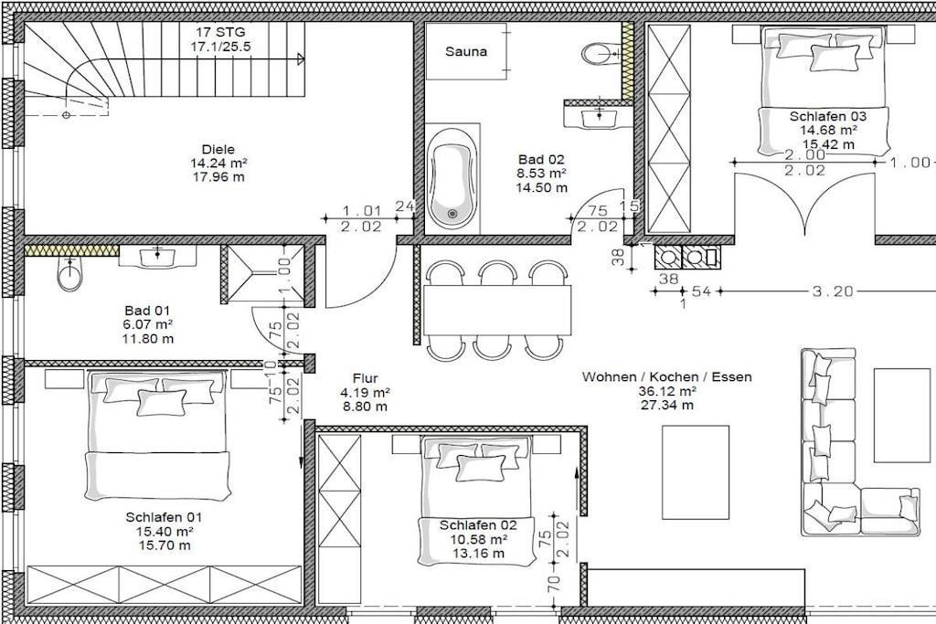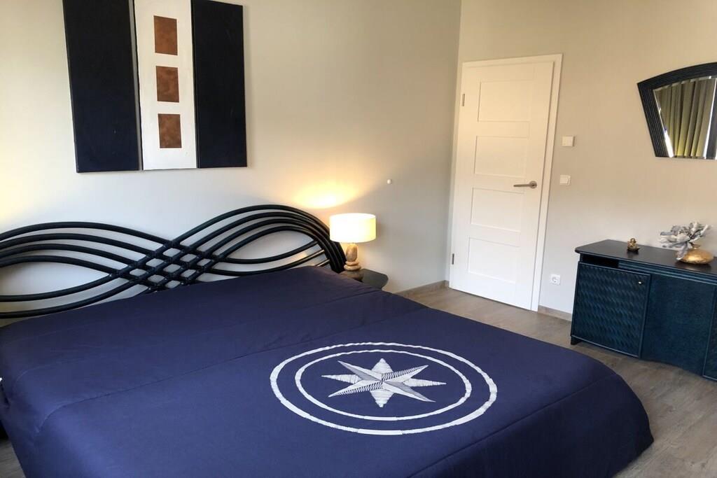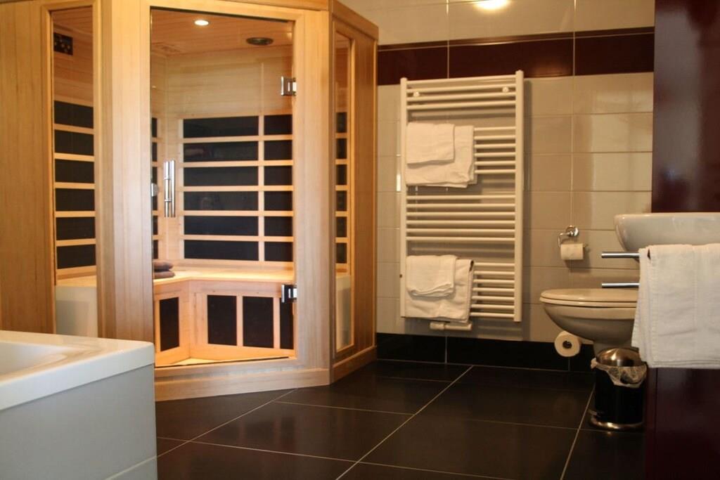 Ground floor: (Living/diningroom(single sofa bed, TV, dining table, heating), bedroom(double bed, TV, heating), bedroom(double bed, TV), bedroom(double bed, TV)) On the 1st floor: (hallway(Wardrobe Coatrack, heating), Kitchen(hob, oven, dishwasher, fridge, heating), bathroom(Mirror, toilet, bath tub, shower, washbasin, heating), bathroom(Mirror, toilet, bath tub, shower, washbasin, heating), relaxation area(sauna, hot tub)) Hot Water, Pier, Vacuum Cleaner, Internet access, washing machine, heating, terrace(Sun Umbrella, garden furniture, sun loungers), parking, ironing board, iron, drying cabinet