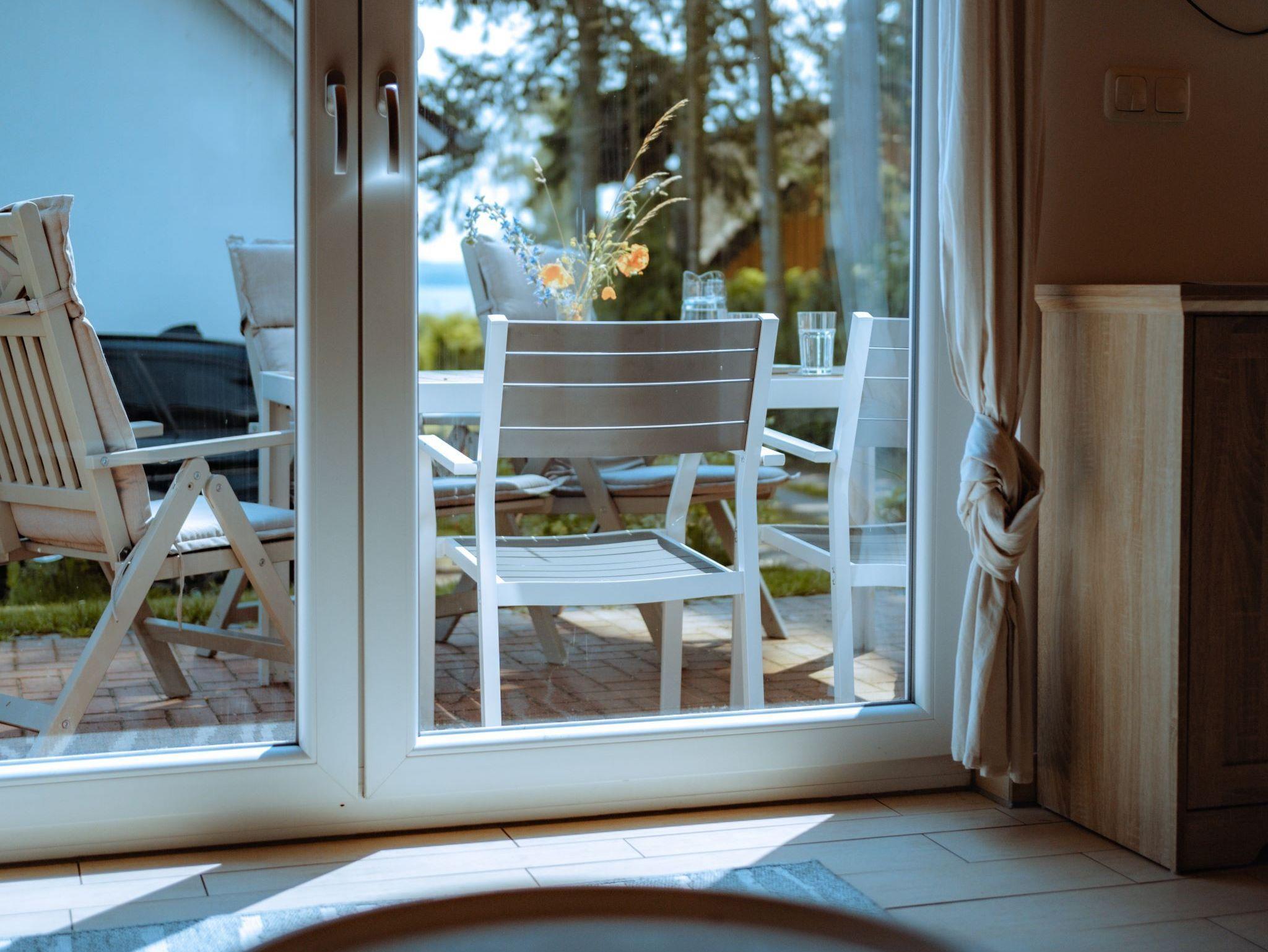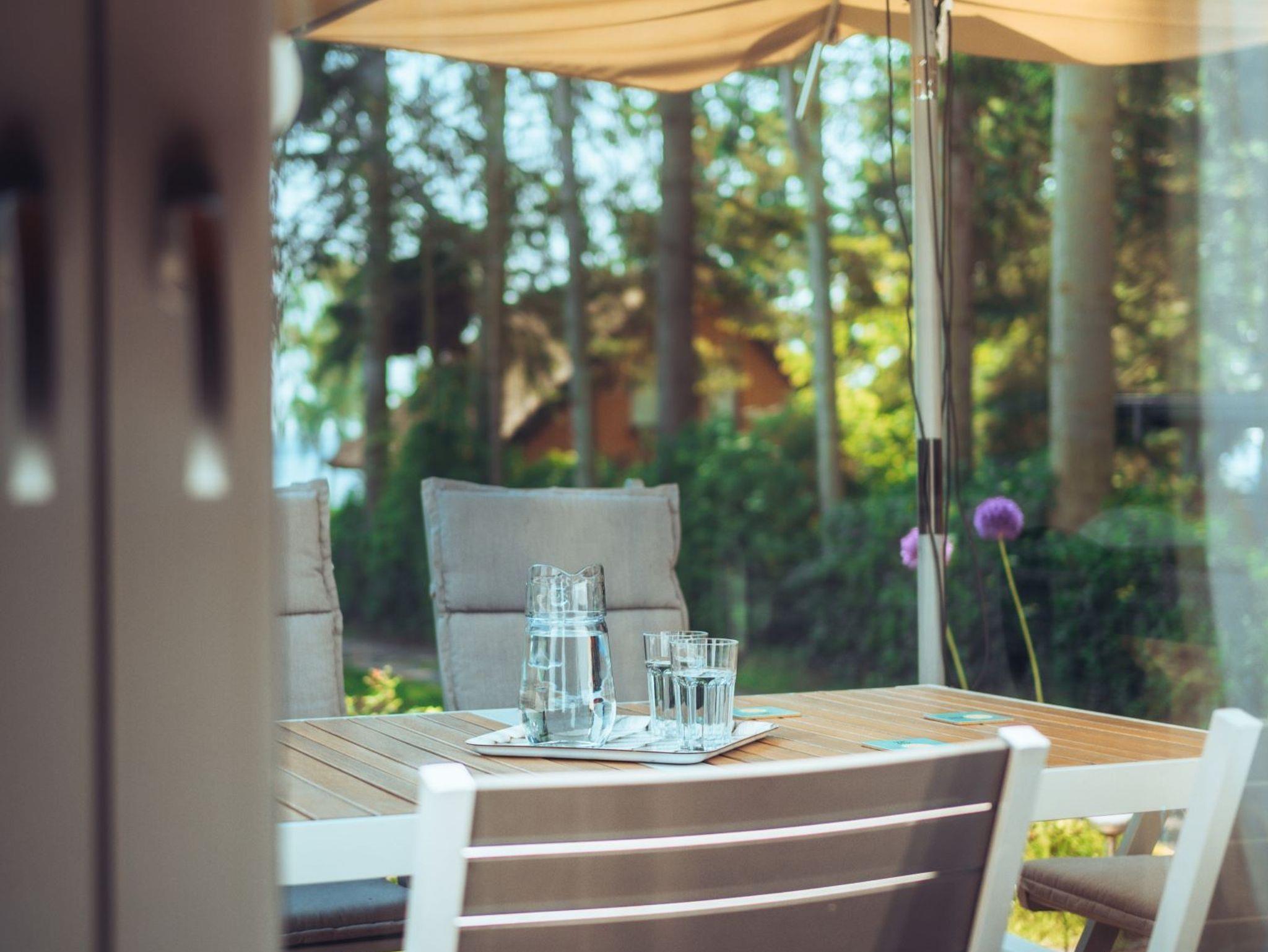 Das Ferienhaus besitzt eine Terrasse mit Seeblick, in der Nähe ist eine Badestelle.