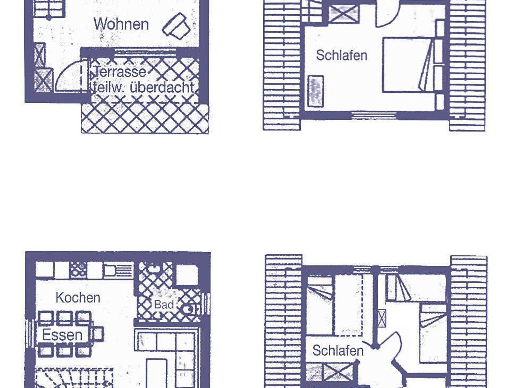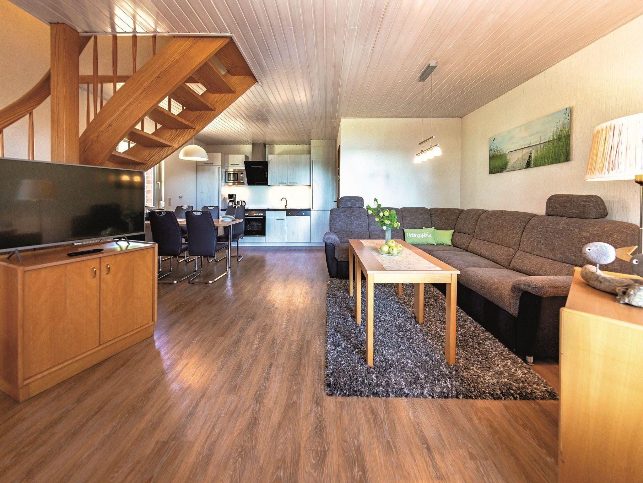 Moderne und sehr komfortable Ausstattung auf 2 Ebenen, mit großzügigem Wohn- und Schlafraum, Küche, Flur, DU/WC, Farb-TV. Im Dachgeschoß 2 oder 3 Schlafräume und Gäste WC, überdachte und möblierte Terrasse.