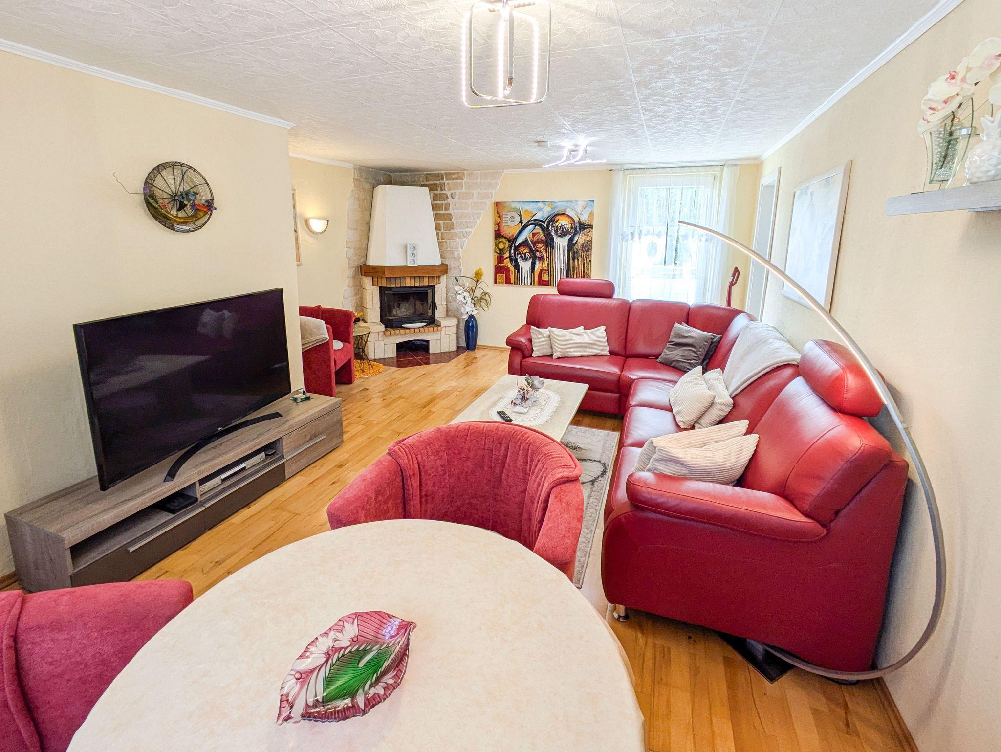 Das Wohnzimmer lädt mit einem großen Ecksofa und einem Smart-TV zu entspannten Abenden ein. Der Kamin sorgt dabei für eine wohlige Atmosphäre, während der Esstisch mit bequemen Sesseln dir Raum für gesellige Stunden bietet. Die separate Einbauküche ist voll ausgestattet ? mit einem Kühlschrank, Ceranfeld, Backofen, Wasserkocher und Kaffeemaschine kannst du hier nach Lust und Laune kochen. Für den morgendlichen Kaffee oder ein kleines Frühstück stehen auch in der Küche zwei Sitzplätze bereit.