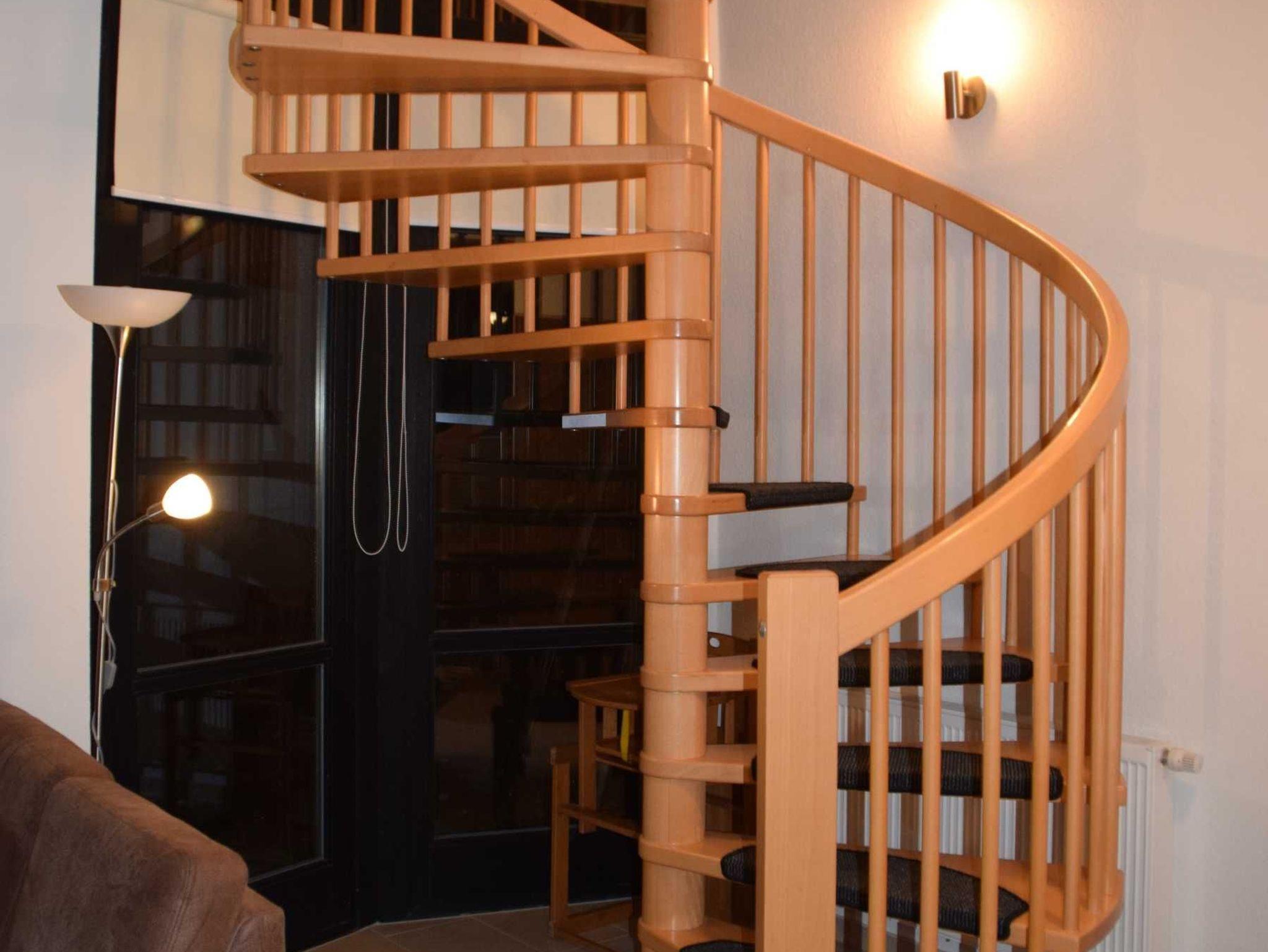 Eine stabile Wendeltreppe führt ins OG. Hier befindet sich ein SZ mit Balkon mit einem Doppelbett und Blick