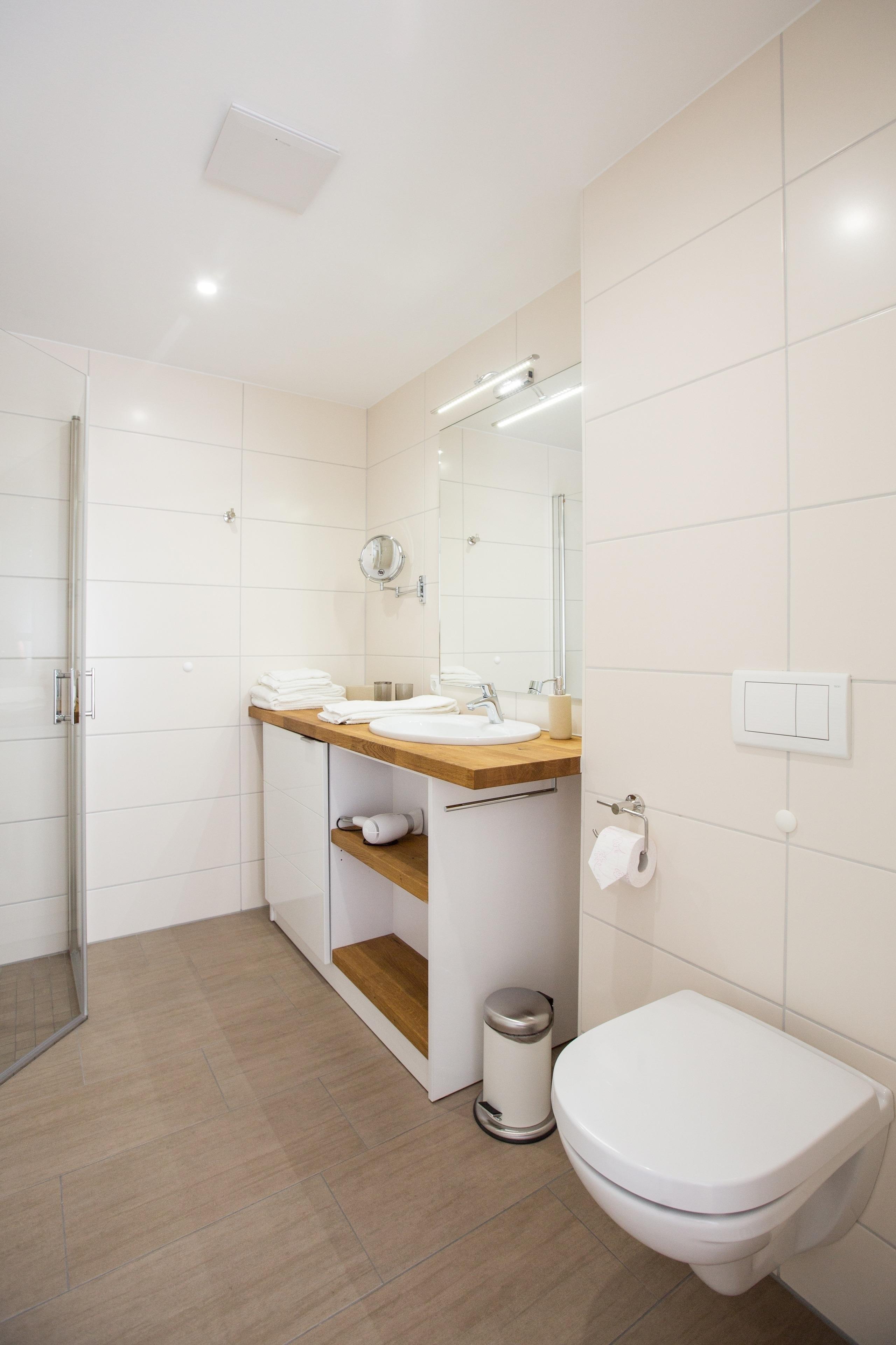 Modernes Bad mit WC, bodengleicher Dusche, Handtuchheizkörper, Waschmaschine, Fön und Kosmetikspiegel.