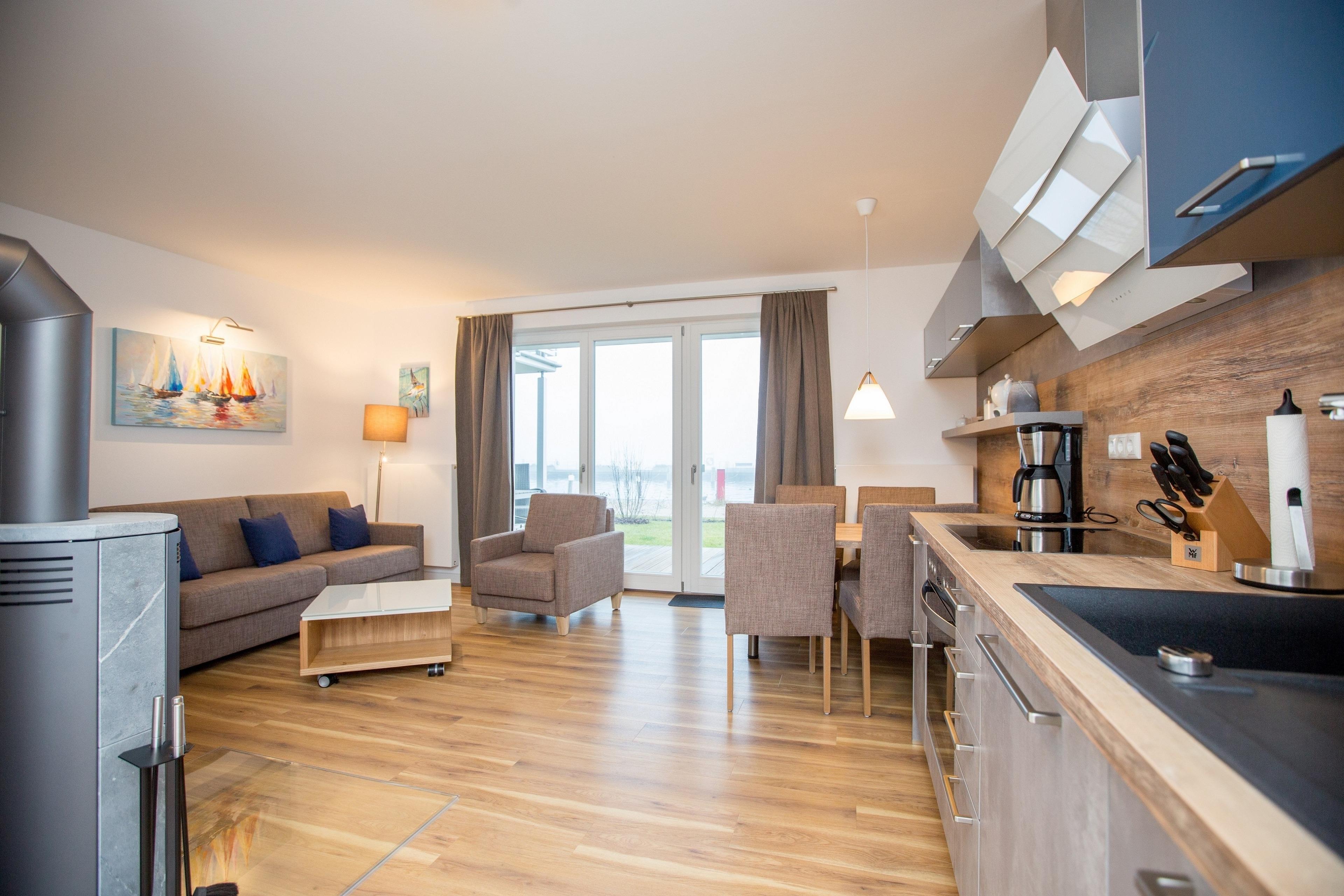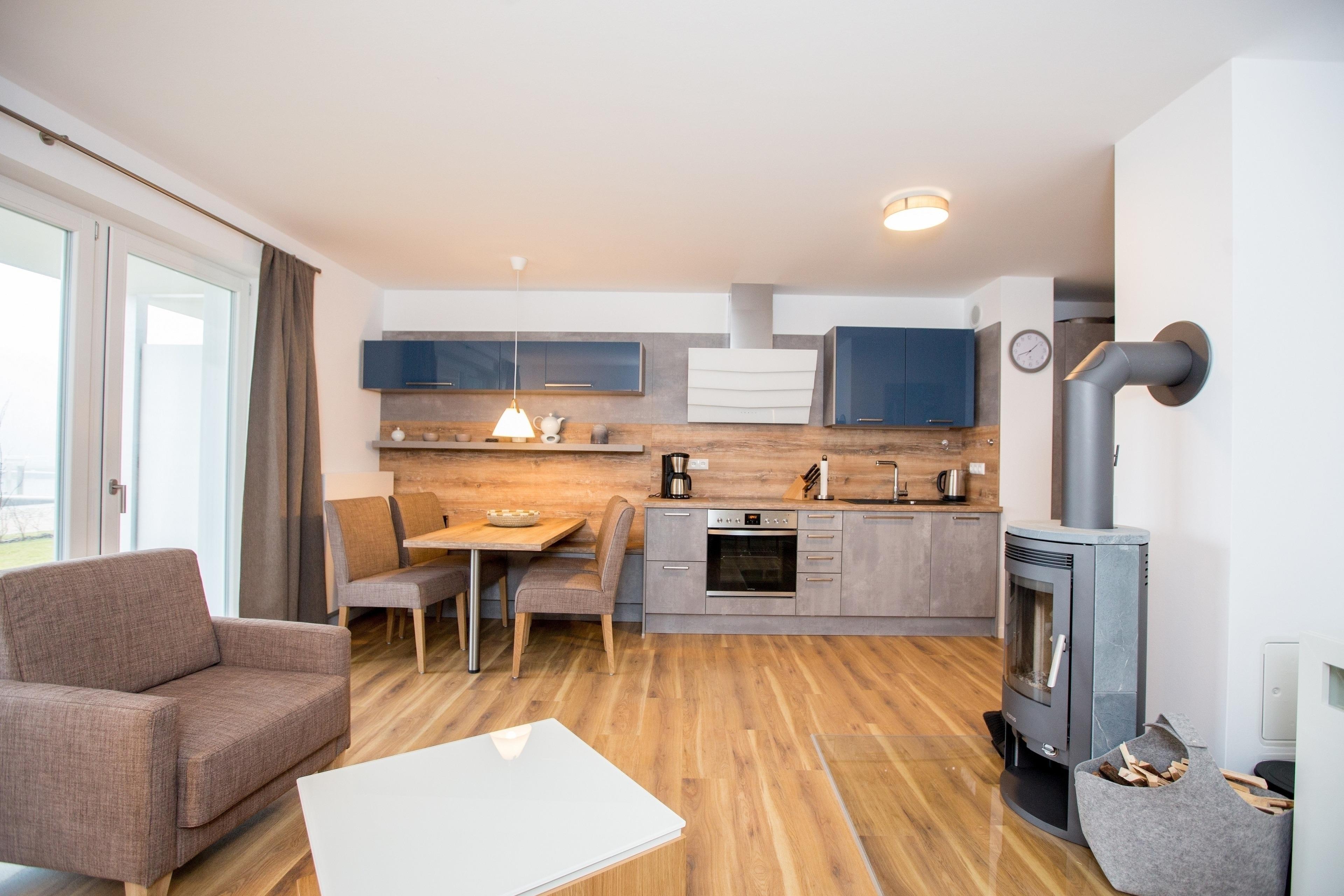 Sideboard, Sofa und Dauerschläfer Bettsofa mit Lattenrost und Matratze 170 x 200 cm und Sessel, Kamin, TV-Flachbildschirm, Tür zur Terrasse, Essplatz, Küchenzeile mit Ceran-Kochfeld, Backofen, Mikrowelle, Kühlschrank mit Gefrierfach, Spülmaschine, Wasserkocher, Kaffeemaschine, Nespressokapselmaschine, Toaster, Geschirr, Kochutensilien und Geschirrtücher.