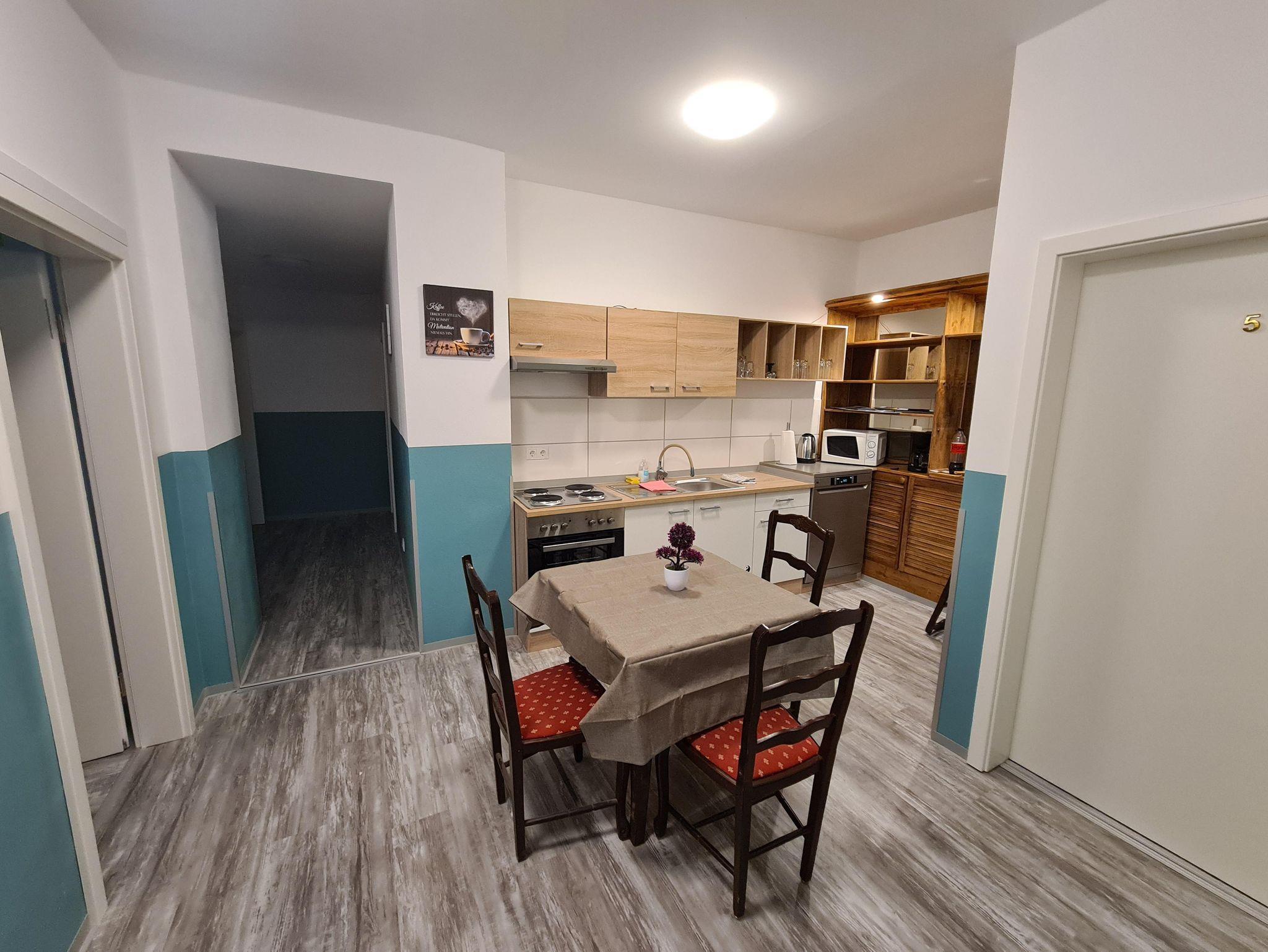 Die Pension verfügt über eine, voll ausgestattete Gemeinschaftsküche (Herd, Backofen, Geschirrspüler, Mikrowelle, Kaffeemaschine, Geschirr usw.). Diese Küche wird Ihnen vollumfänglich zur Verfügung gestellt, da kein Frühstück angeboten wird. Die Zimmer befinden sich im Erdgeschoss eines Mehrfamilienhauses und werden als Einzel- oder Doppelzimmer vermietet. Jedes Zimmer verfügt zusätzlich zur standardmäßigen Ausstattung noch über einen kleinen Kühlschrank.