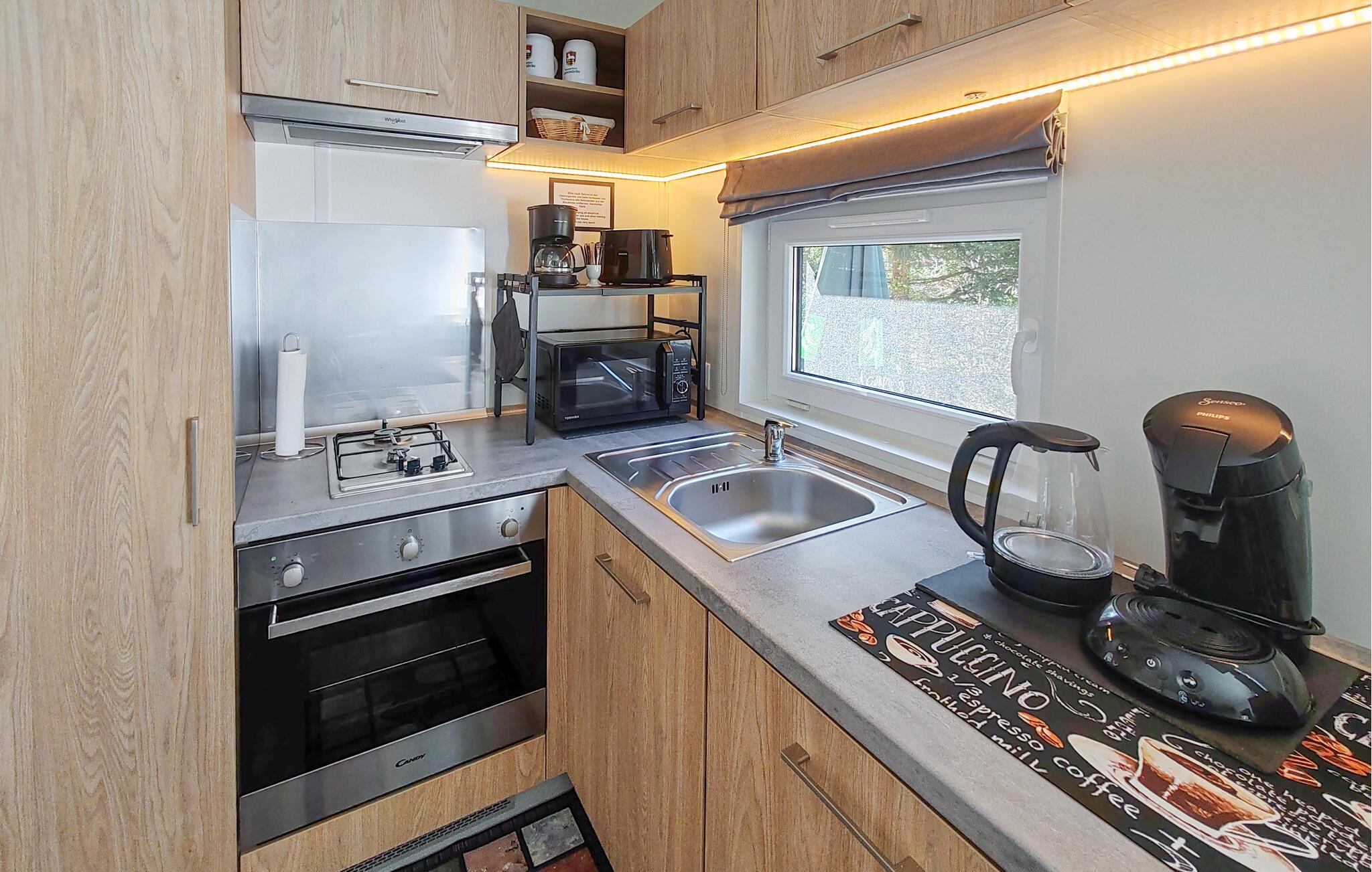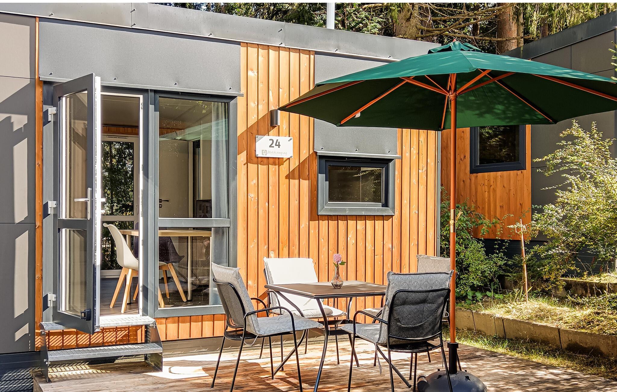 Det mysiga vardagsrummet med bäddsoffa, matplats och ett välutrustat pentry bjuder in dig att tillbringa tid tillsammans med din familj. Det separata sovrummet är en underbar plats att drömma på. Sovsoffan i vardagsrummet är 170 cm lång och passar därför endast barn. Tiny House har dessutom ett eget badrum med dusch.