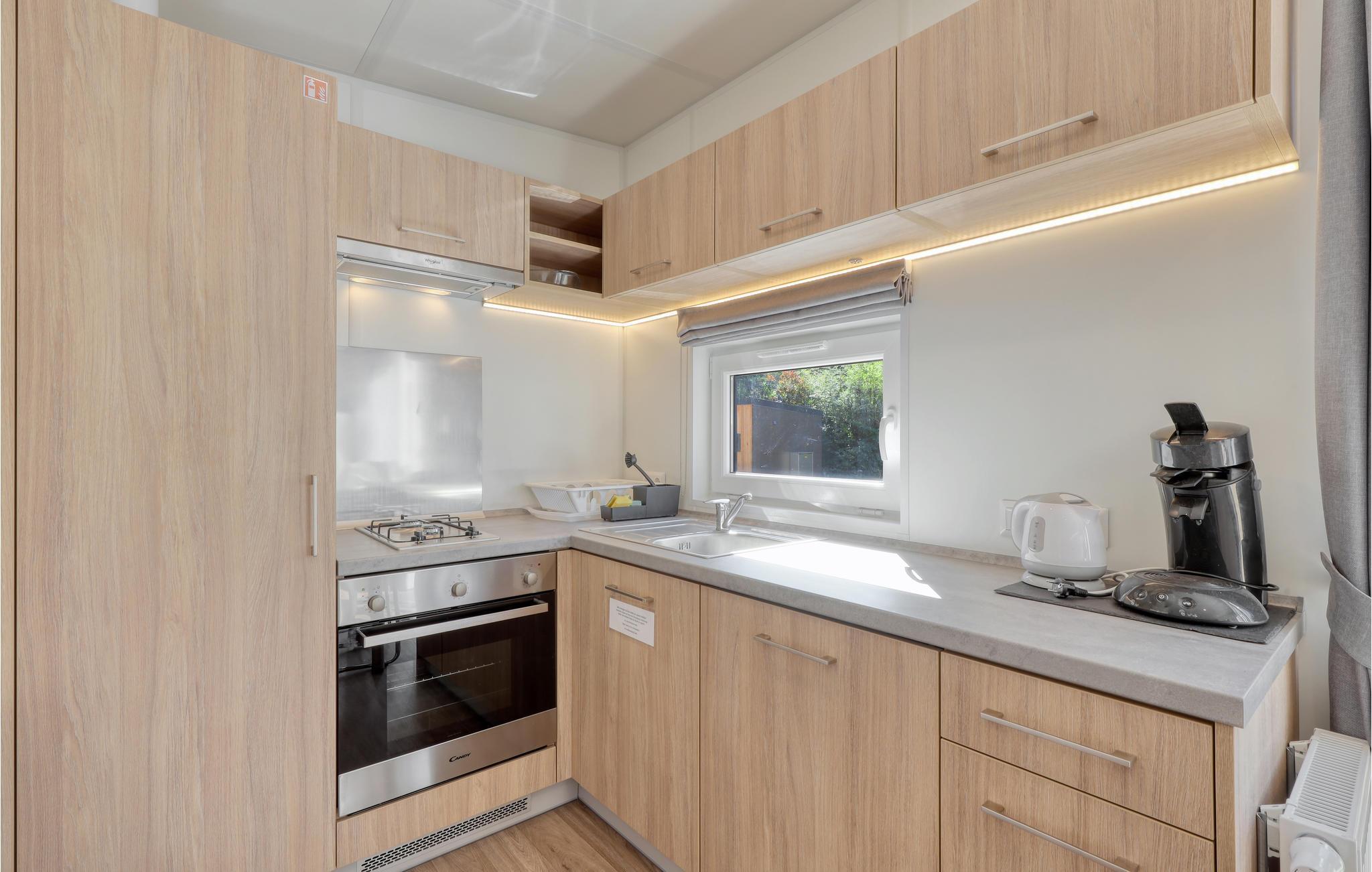 Det mysiga vardagsrummet med bäddsoffa, matplats och ett välutrustat pentry bjuder in dig att tillbringa tid tillsammans med din familj. Det separata sovrummet är en underbar plats att drömma på. Sovsoffan i vardagsrummet är 170 cm lång och passar därför endast barn. Tiny House har dessutom ett eget badrum med dusch.