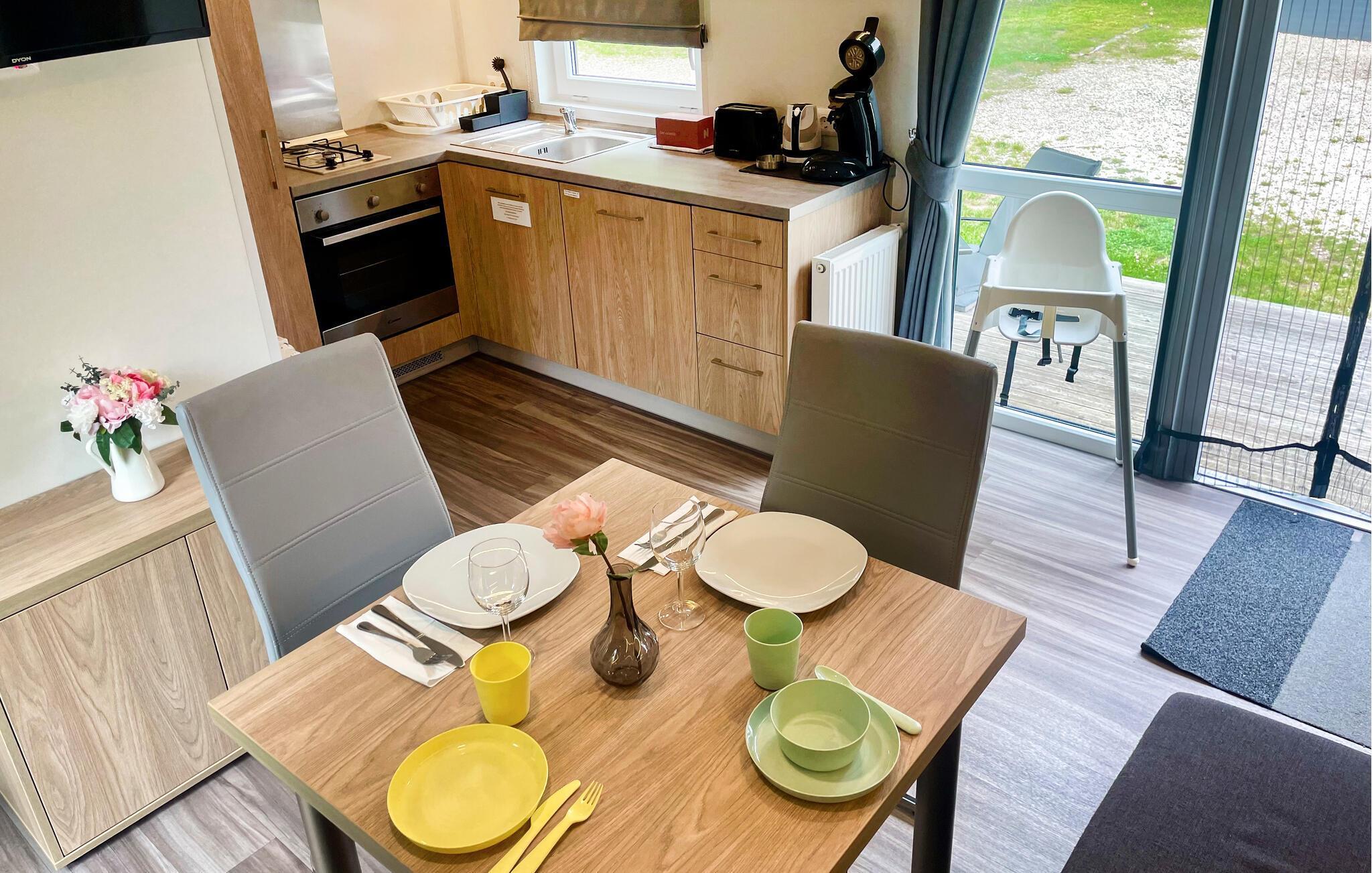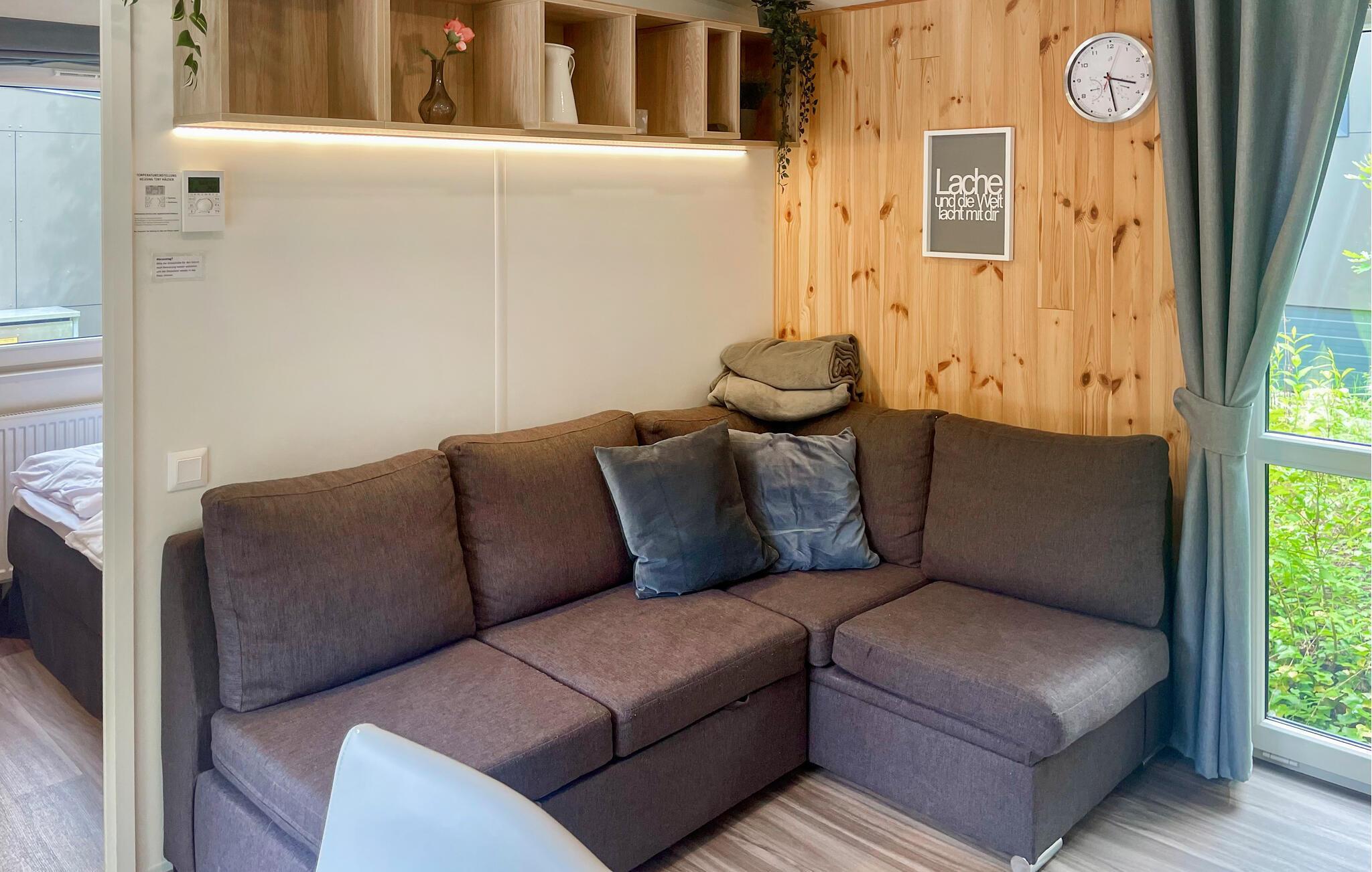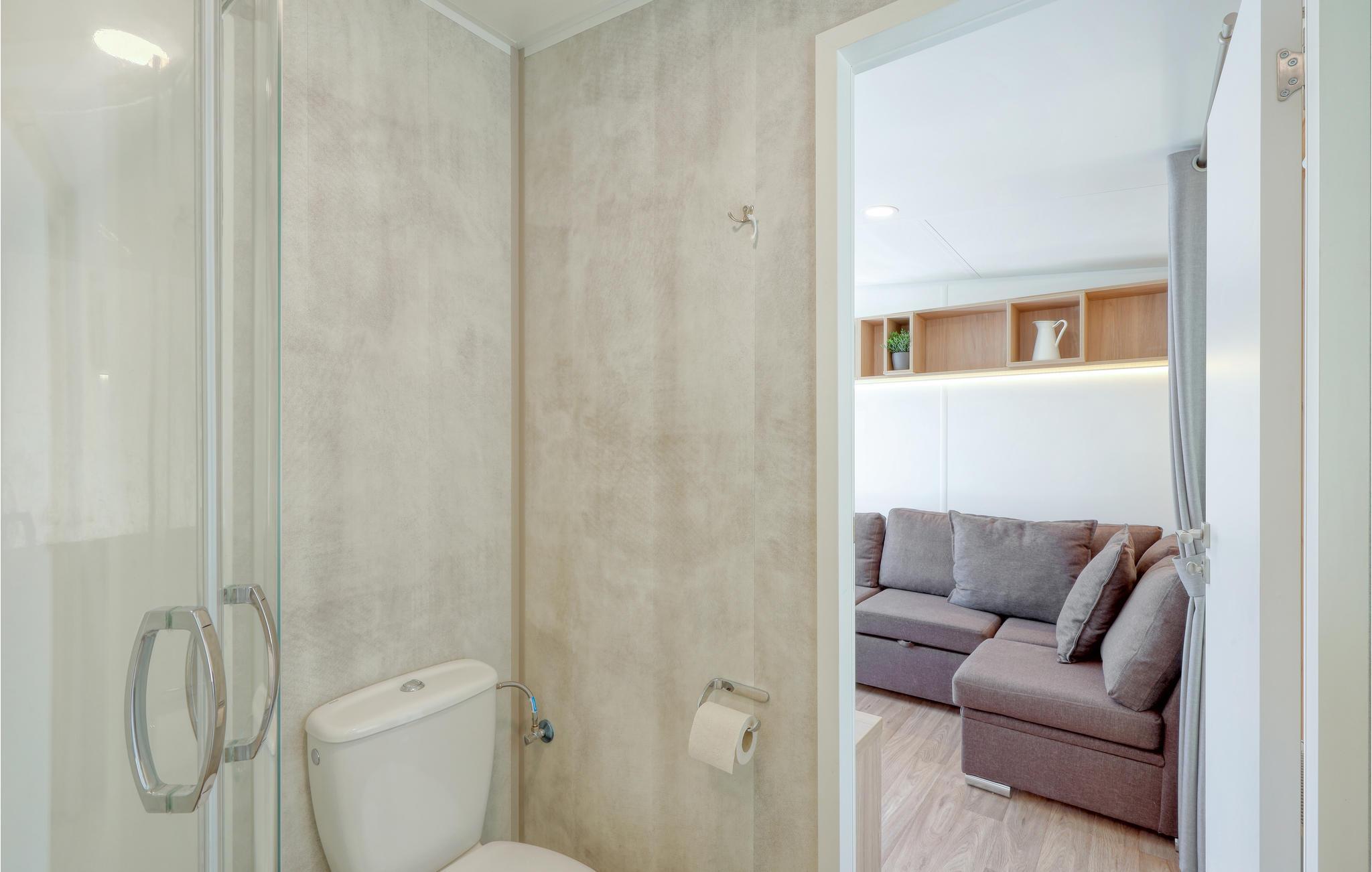 Det mysiga vardagsrummet med bäddsoffa, matplats och ett välutrustat pentry bjuder in dig att tillbringa tid tillsammans med din familj. Det separata sovrummet är en underbar plats att drömma på. Sovsoffan i vardagsrummet är 170 cm lång och passar därför endast barn. Tiny House har dessutom ett eget badrum med dusch.