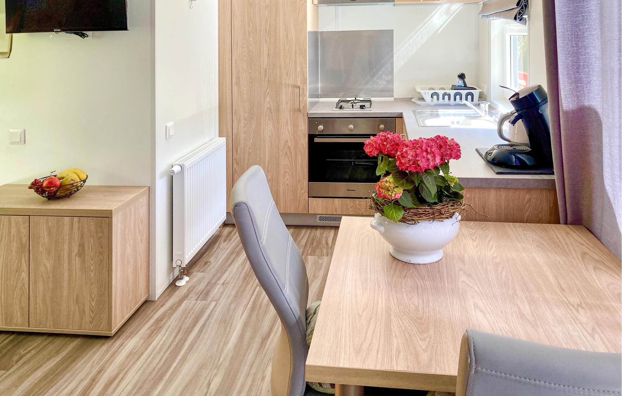 Det mysiga vardagsrummet med bäddsoffa, matplats och ett välutrustat pentry bjuder in dig att tillbringa tid tillsammans med din familj. Det separata sovrummet är en underbar plats att drömma på. Sovsoffan i vardagsrummet är 170 cm lång och passar därför endast barn. Tiny House har dessutom ett eget badrum med dusch.