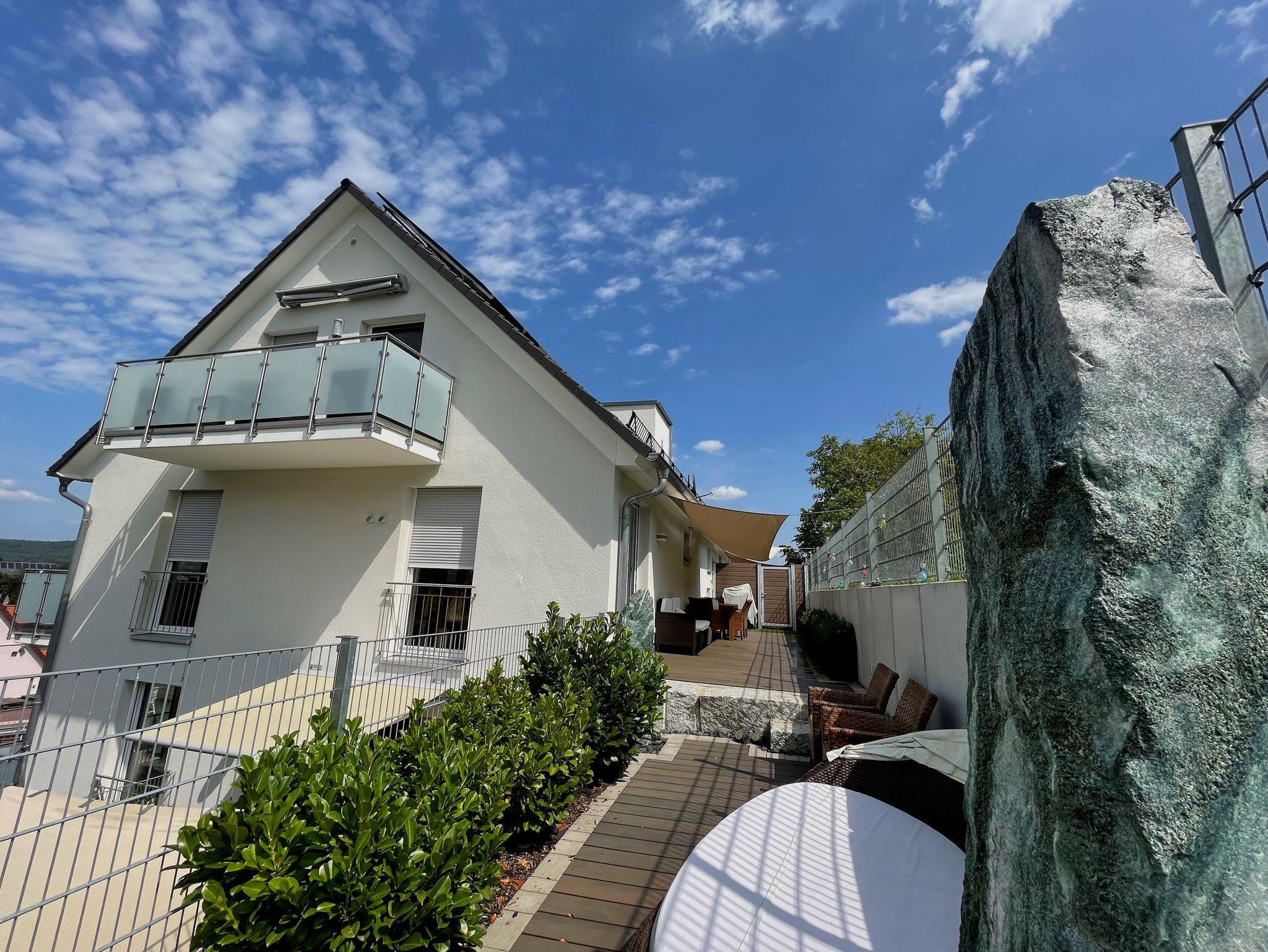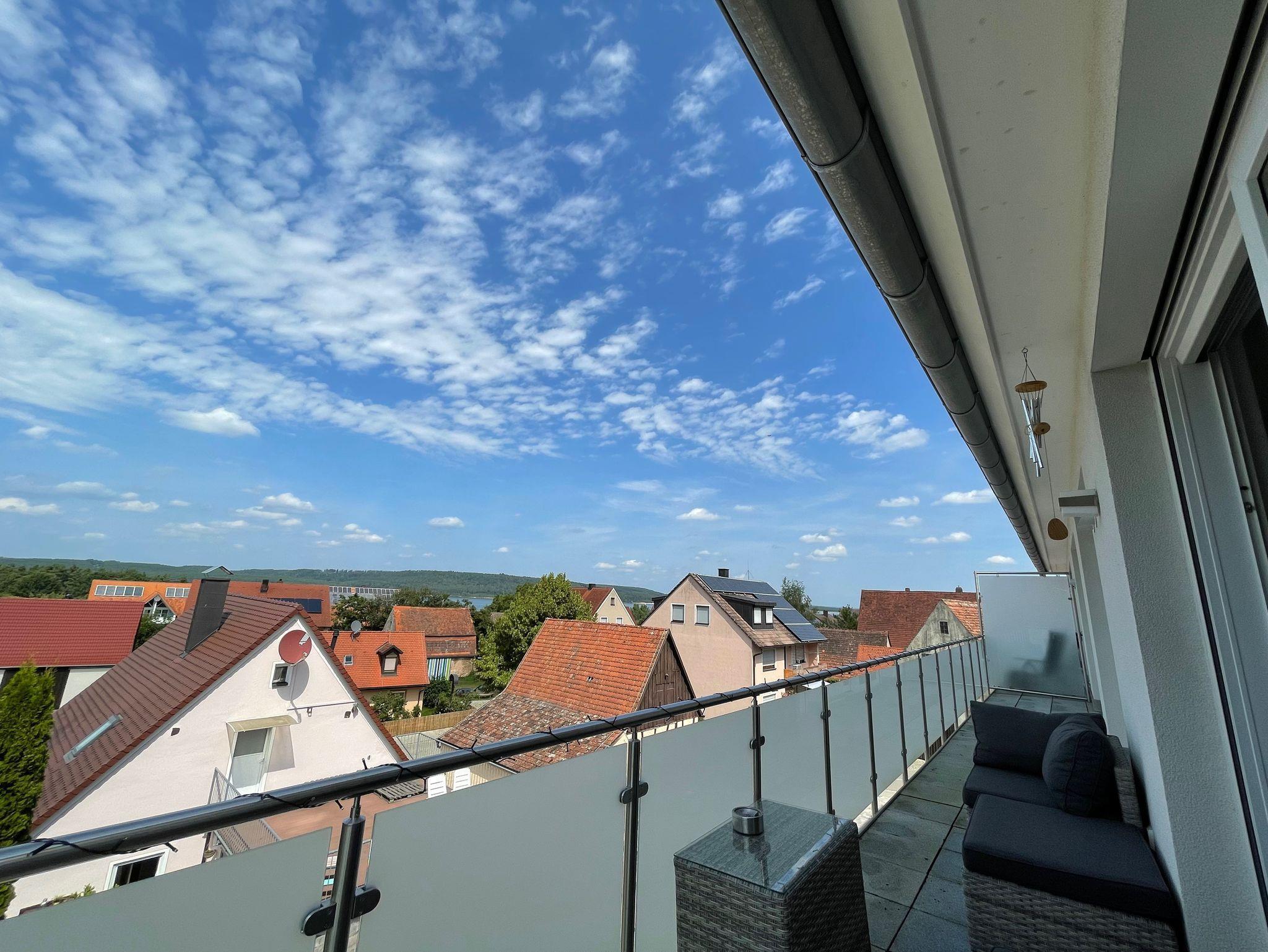 Das Haus wurde XXXXXX neu gebaut. Die Wohnung hat eine Größe von ca. 95 m². Sie ist barrierefrei und bequem mit einem Aufzug zu erreichen. Sie verfügt über zwei Schlafzimmer und einen großen Wohn-, Ess-, Küchenbereich. Das Bad verfügt über eine Dusche und Badewanne, Doppelwaschbecken sowie WC. In allen Räumen, ausser Bad, ist ein handgehobelter, geölter Eichenparkett verlegt, der für ein angenehmes Raumklima sorgt. In den Sommermonaten können Sie Ihren ersten morgendlichen Kaffee oder den letzten abendlichen Wein gemütlich auf dem großen Balkon, mit Blick auf den Brombachsee oder auf der großen Terrasse mit Blick ins Grüne genießen.