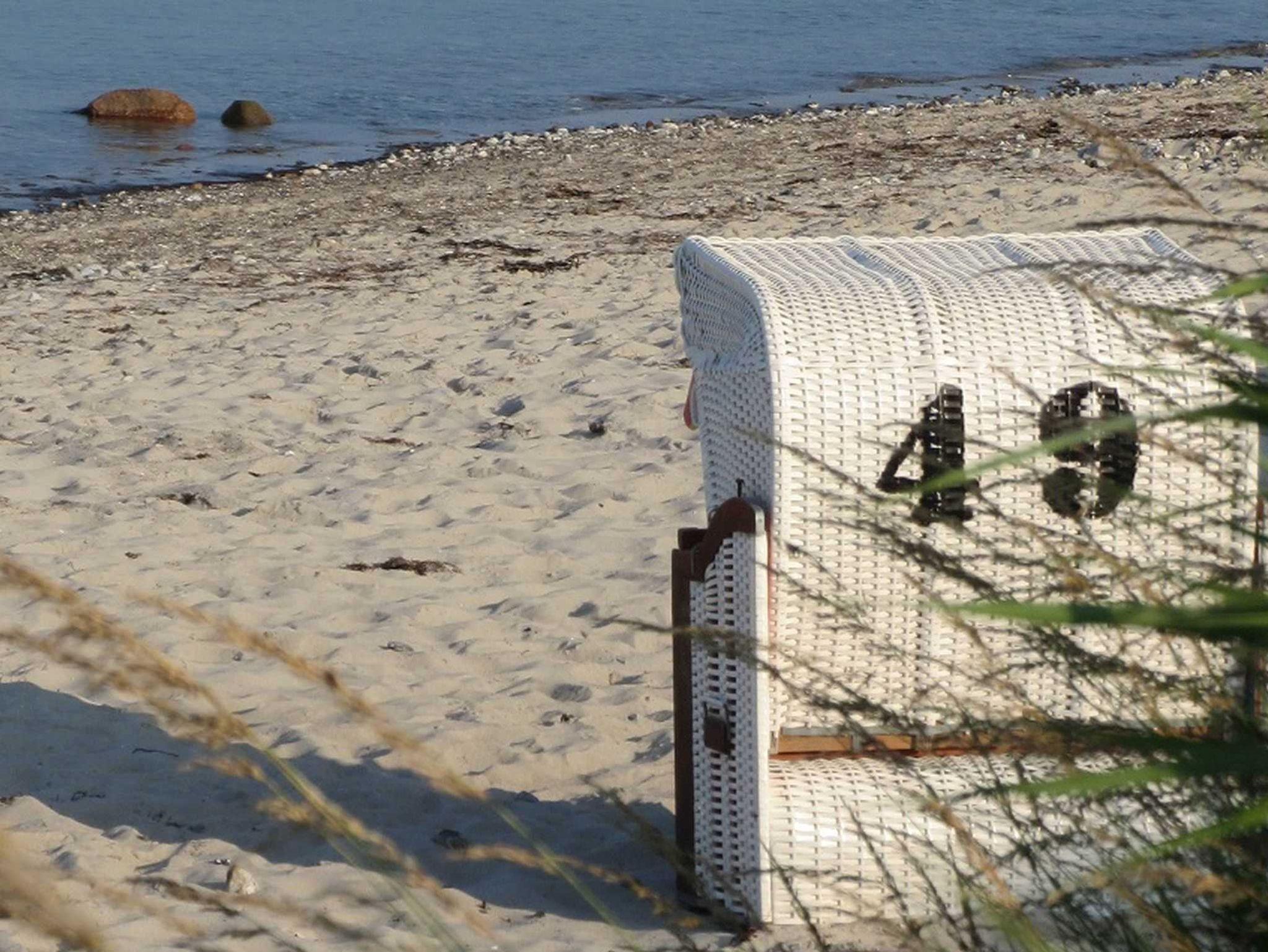 - teilweise überdachte Terrasse mit Sitzmöbeln, Strandkorb und weitem Blick über Wiesen und Felder.