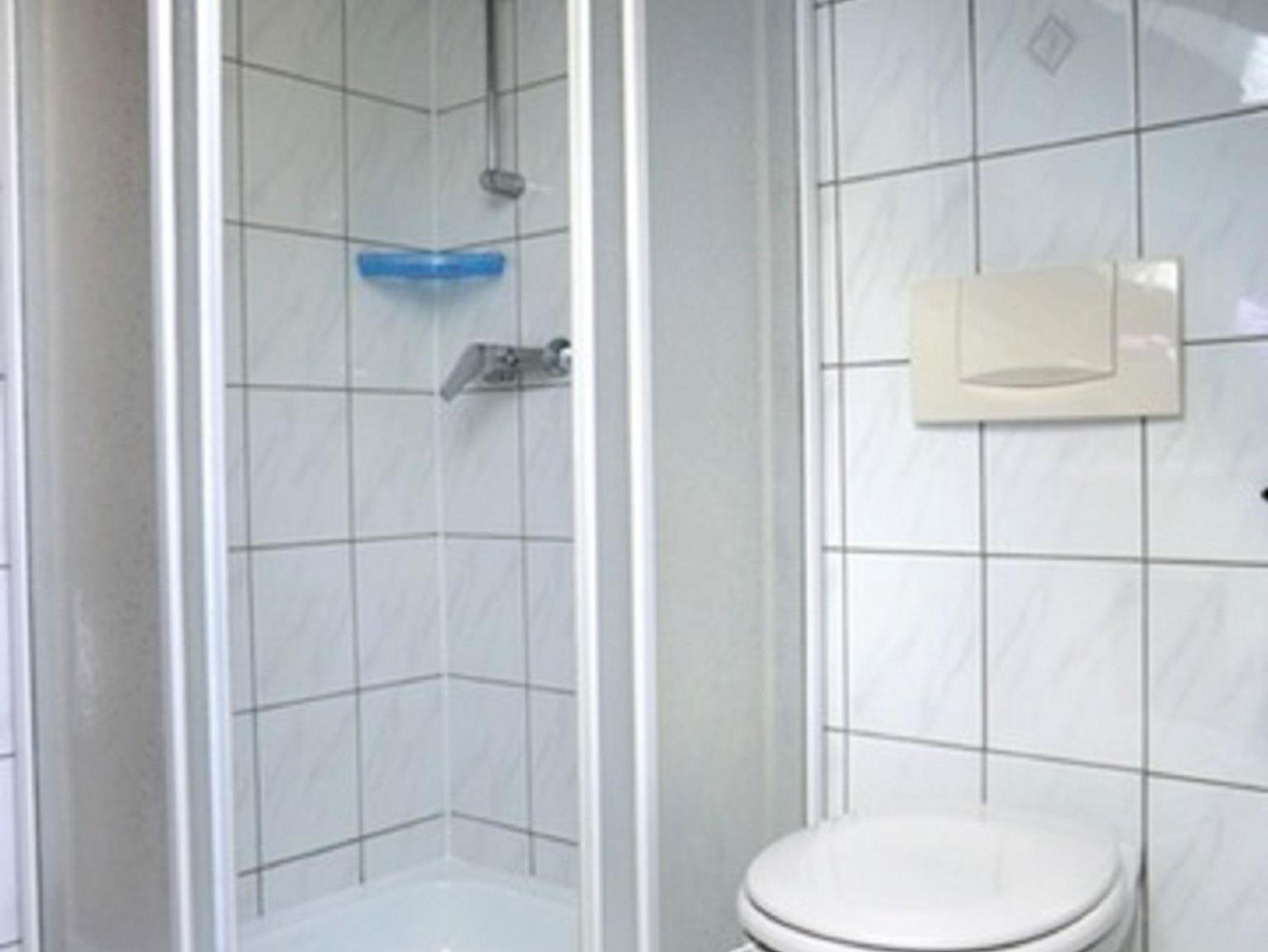 Das Badezimmer ist mit Dusche, WC und Waschbecken ausgestattet.