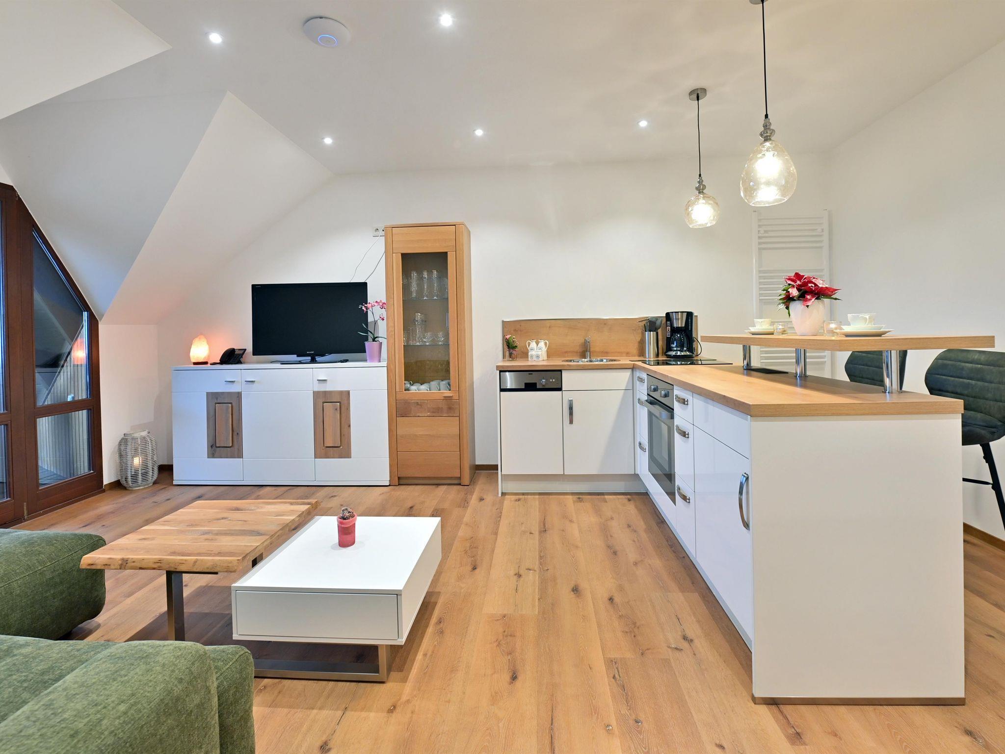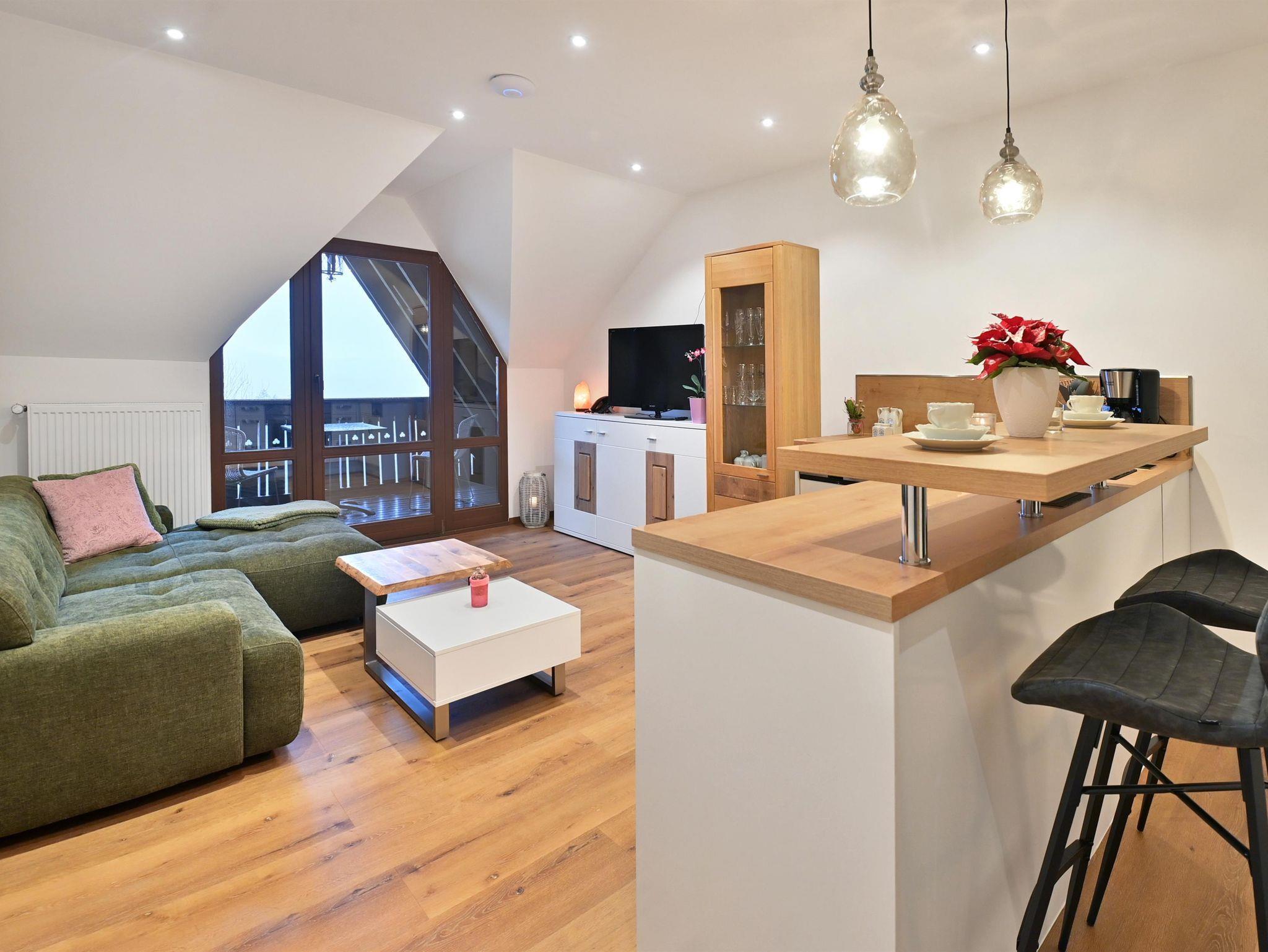 Im modernen Landhausstil eingerichtete Ferienwohnung auf ca. 40qm mit 2 Balkonen mit Blick auf die Rhöner Berglandschaft insbesondere den Kreuzberg und den Heidelstein. Platz für 1-3 Personen. Gemütliches Wohn- Esszimmer mit TV. Komplett ausgestattete Küche mit Geschirrspüler, Kühlschrank inkl. Gefrierfach, Herd mit elektrisch versenkbarer Dunstabzugshaube, Backofen, Wasserkocher und Kaffeemaschine. Schlafzimmer mit Doppelbett. Badezimmer mit Dusche/WC, großem beleuchtetem Spiegel, Kosmetikspiegel. WLAN und Parkplatz kostenfrei. Frühstück und Brötchenservice buchbar. Alle Wohnungen verfügen über Brandschutztüren und Rauchmeldeanlage. Ski- und Fahrradraum. Poppenhausen ist 4km, Gersfeld 6km entfernt. Bushaltestelle in 3 Gehminuten vom Haus. Shuttleservice buchbar.