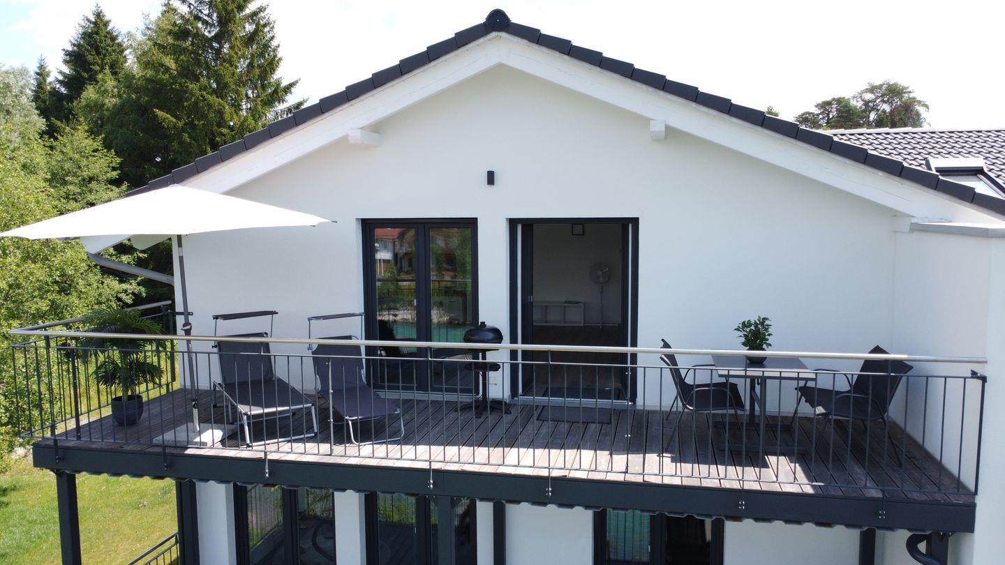 Vom Wohnbereich betreten Sie einen großen Balkon mit traumhaften Blick auf den Lech und Lechbruck am See.