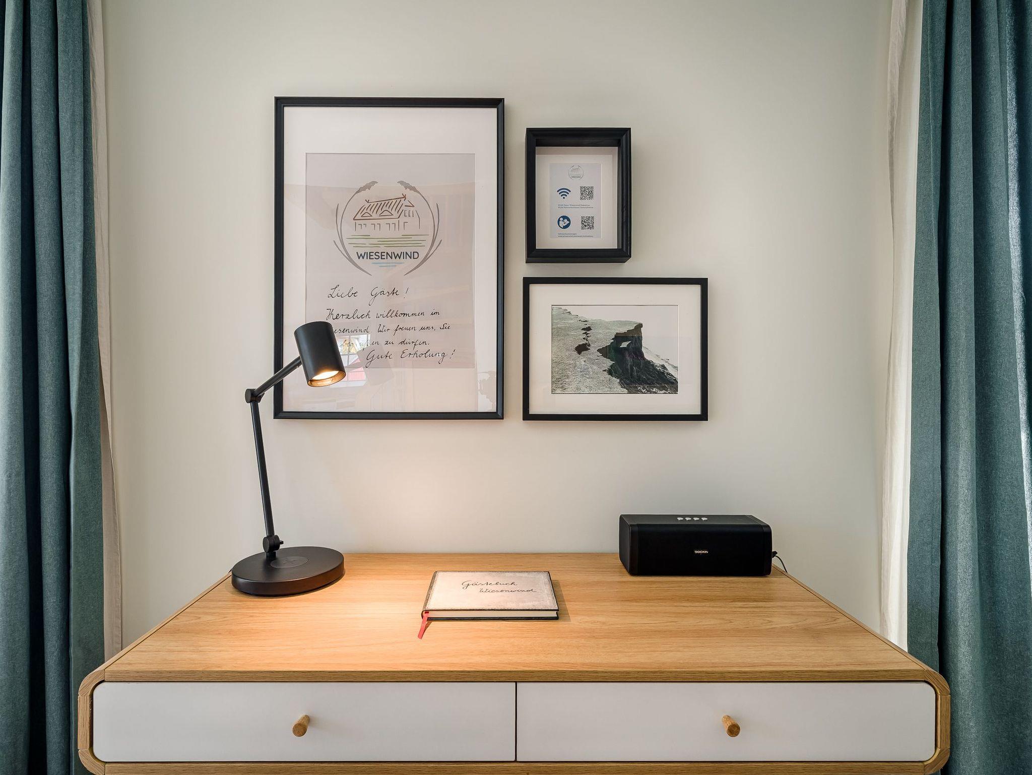 Wohnraum mit 2 Ledersofa, Leseecke mit 2 Ohrensesseln, Schreibtisch mit Lampe (USB-C Anschluss und direkte Handylademöglichkeit), Samsung The Frame TV, Bluetooth-Box, Kaminofen, Esstisch für 8 Personen