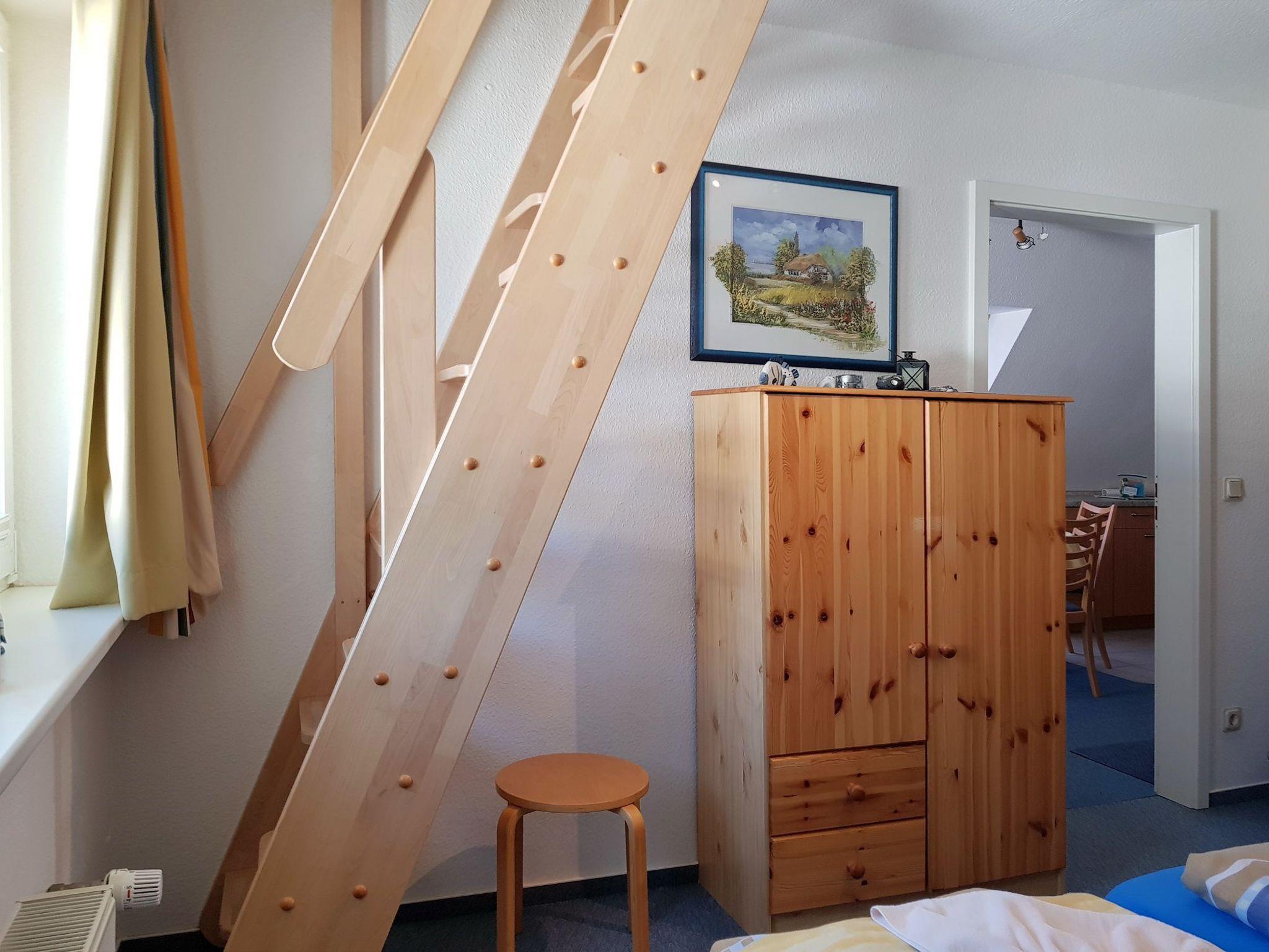 Das Dachzimmer (zweite Ebene), ist nur durchs Schlafzimmer per recht steiler Holztreppe erreichbar. Im Dachzimmer (12 qm) befinden sich 2 vollwertige Betten aber es besteht nur aus Dachschrägen (Mitte 1.60 hoch). Für Kinder ab ca. 7 J. gut geeignet.