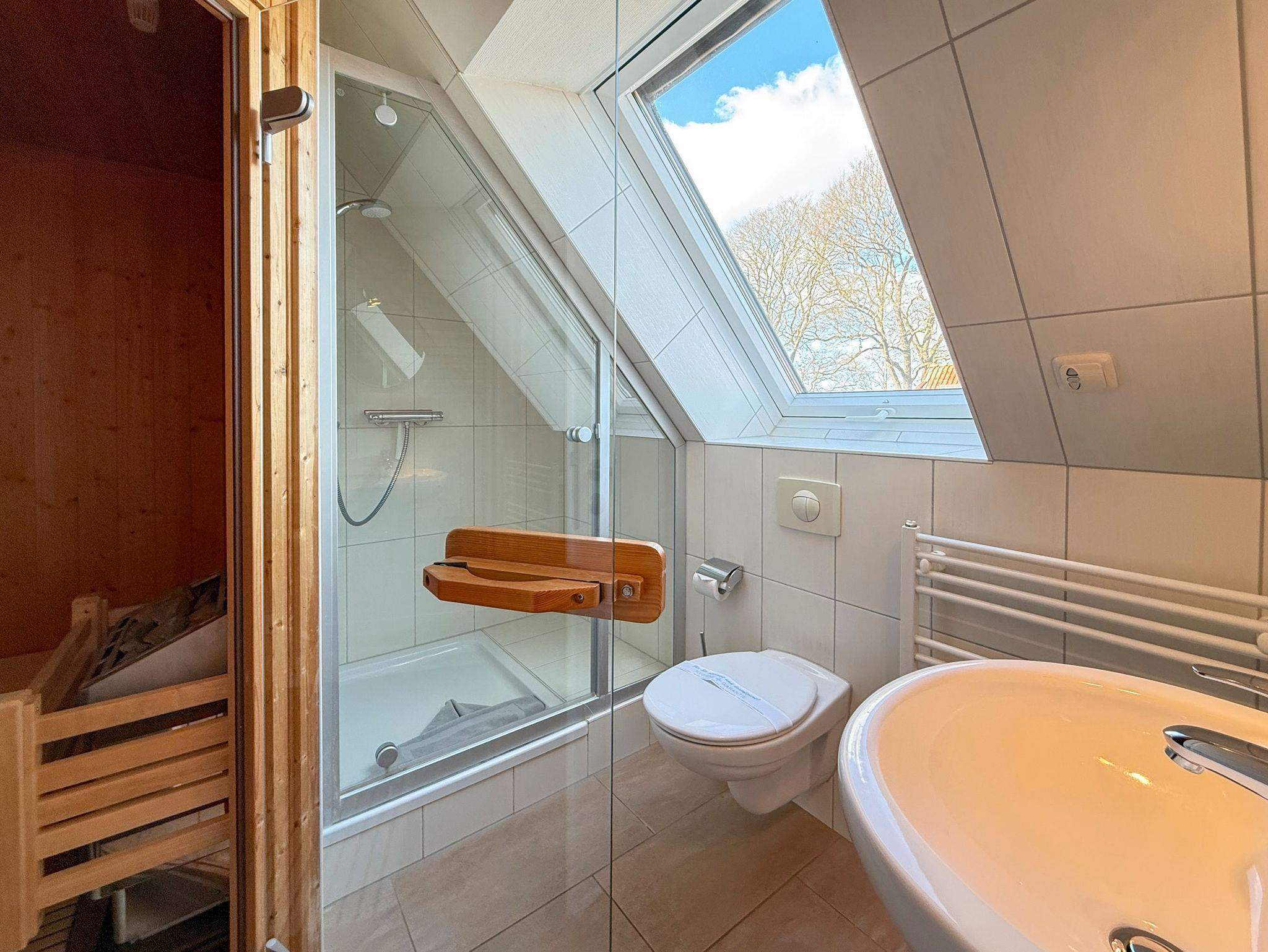 • Badezimmer: Modernes Bad mit ebenerdiger Dusche/WC und Haartrockner.