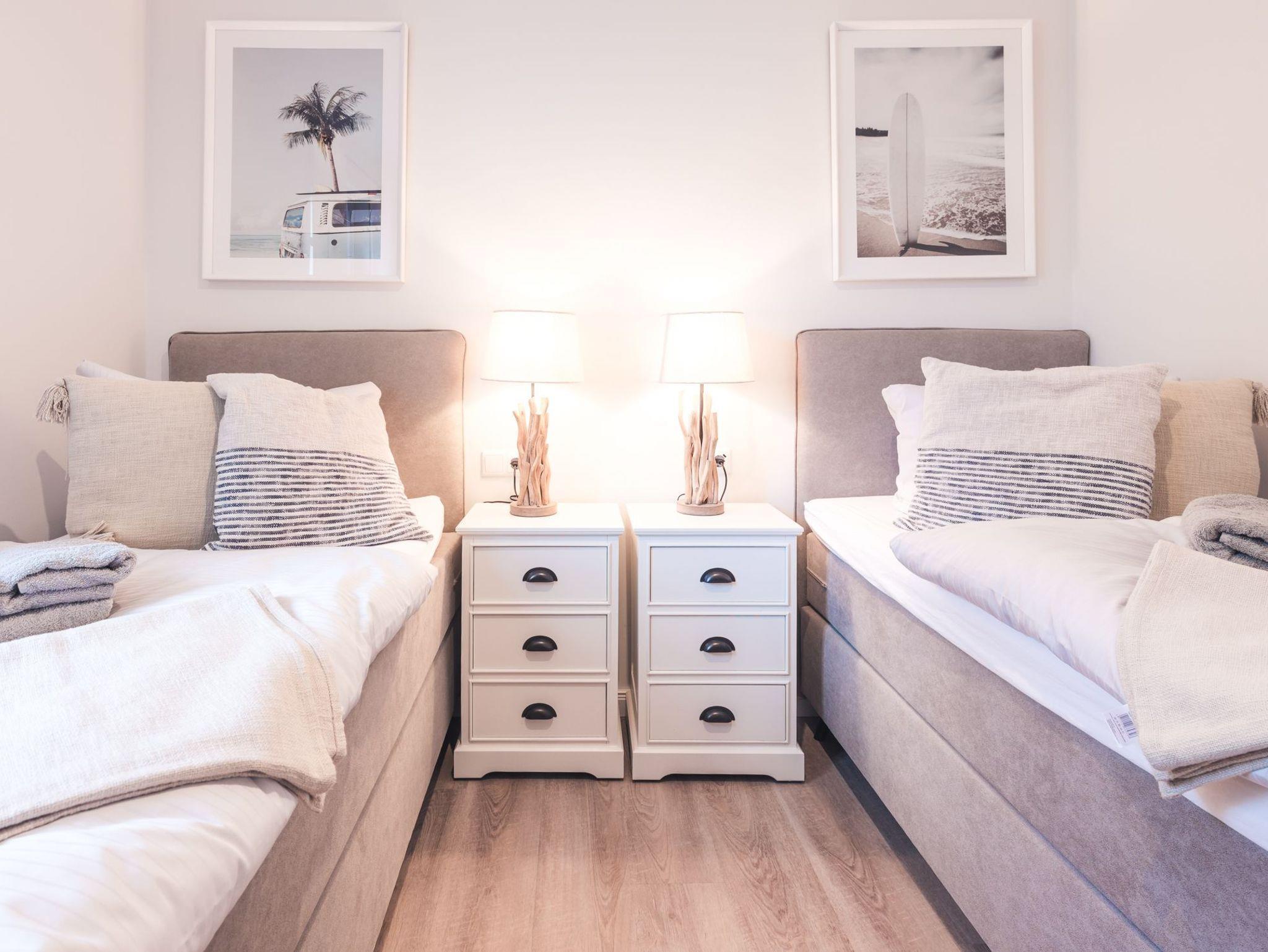 Insgesamt verfügt die Ferienwohnung über zwei separate Schlafzimmer. Eines davon ist mit einem sehr komfortablen Boxspring-Doppelbett ausgestattet.