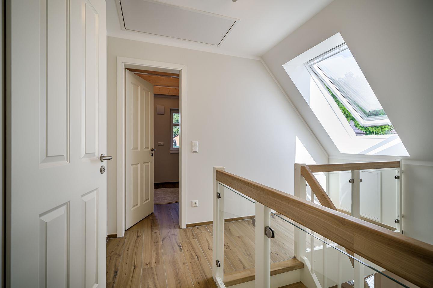 Offene Deckenstruktur in den Schlafzimmern vermittelt ein angenehmes Raumklima, dazu der lichtdurchflutete Flur…