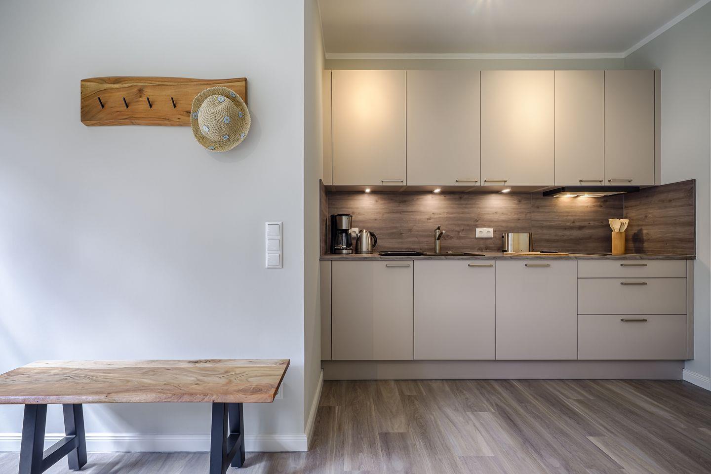 offene Einbauküche mit 2 Platten Induktionsherd und Esstisch für 2 Personen