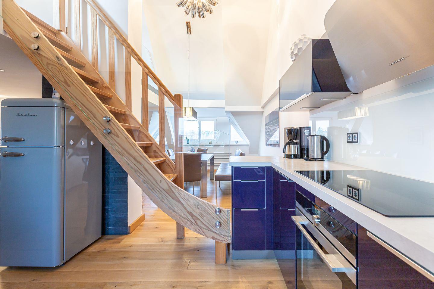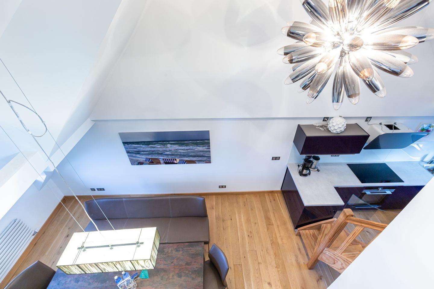 Noch eine Treppe höher erwartet dich ein Chillout-Bereich mit Sofa – der perfekte Ort, um die Ruhe zu genießen und den Ausblick auf die umliegende Natur schweifen zu lassen. Ein kleiner Balkon ergänzt das Angebot und schafft zusätzlichen Raum für entspannte Momente an der frischen Luft.