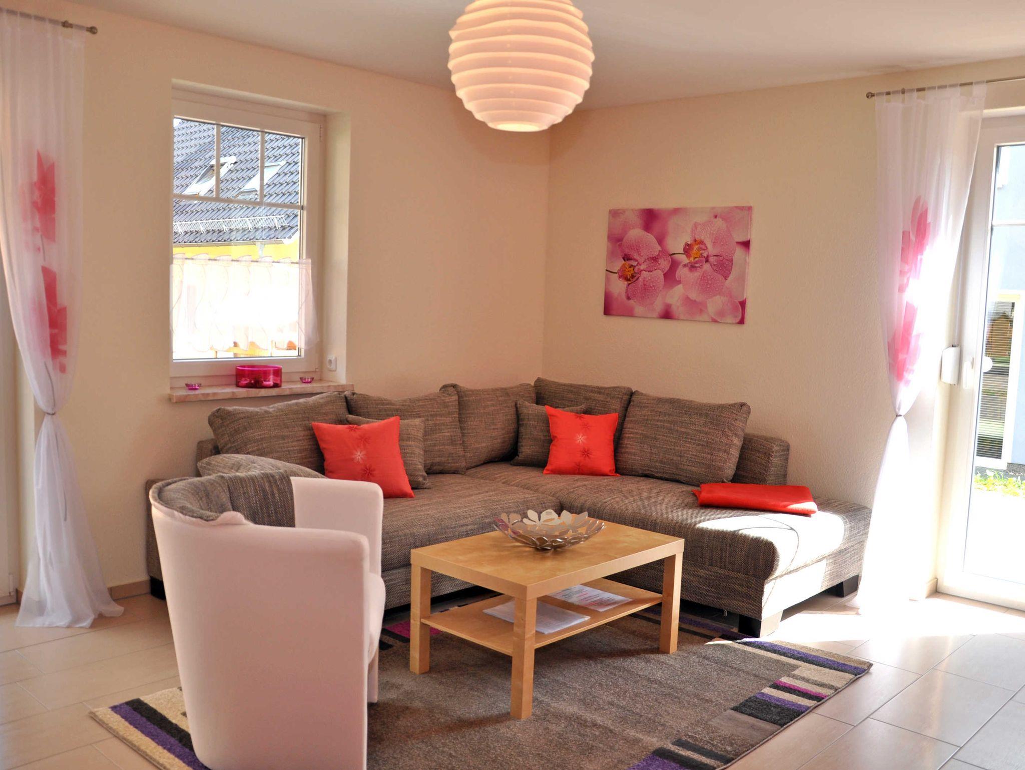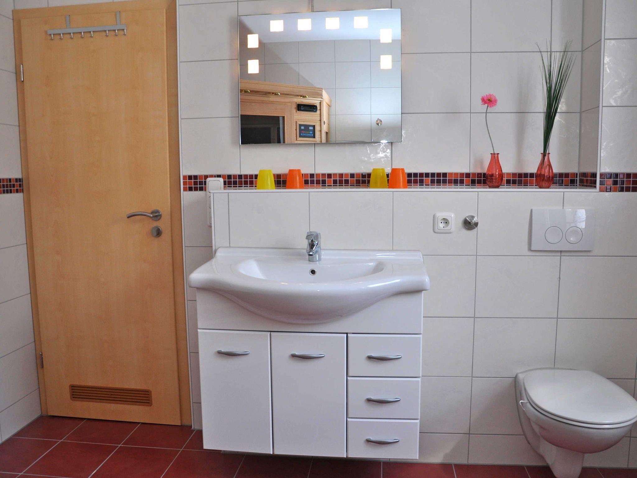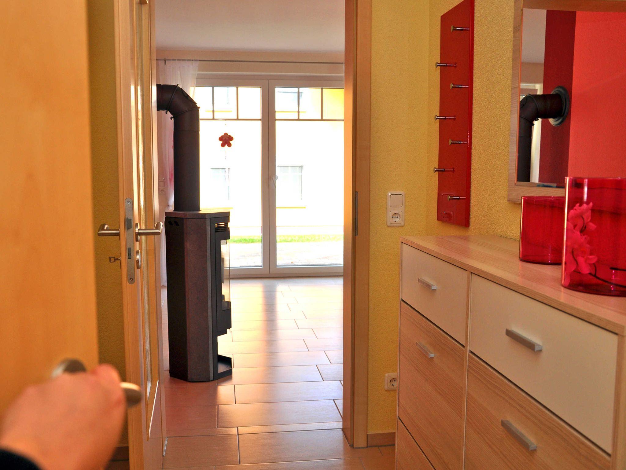 Eine Aufbettungsmöglichkeit besteht im Wohnzimmer. Die Couch verfügt über eine Schlaffunktion. Darüber hinaus verfügt das EG-Appartement über 1 Bad mit Dusche sowie einer Infrarot-Sauna und Kamin, kostenfreien WLAN, Wohn- /Essbereich mit vollwertiger Einbauküche mit Spülmaschine, Kühl-/Gefrierfunktion, Ceranherd und Mikrowelle stehen ebenfalls zur Verfügung.
