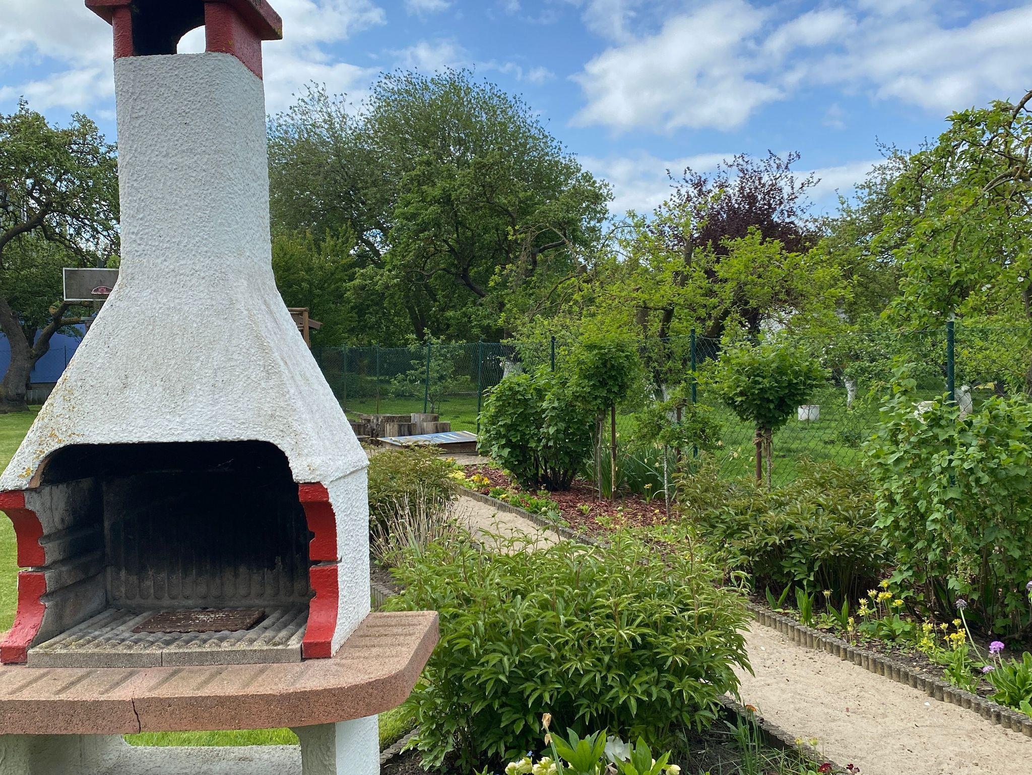Am Haus: Gepflegter, eingezäunter Garten. Überdachte Terrasse mit Grillkamin, Räucherofen und Gartenmöbel. Kleiner Spielplatz im Garten für Kinder.