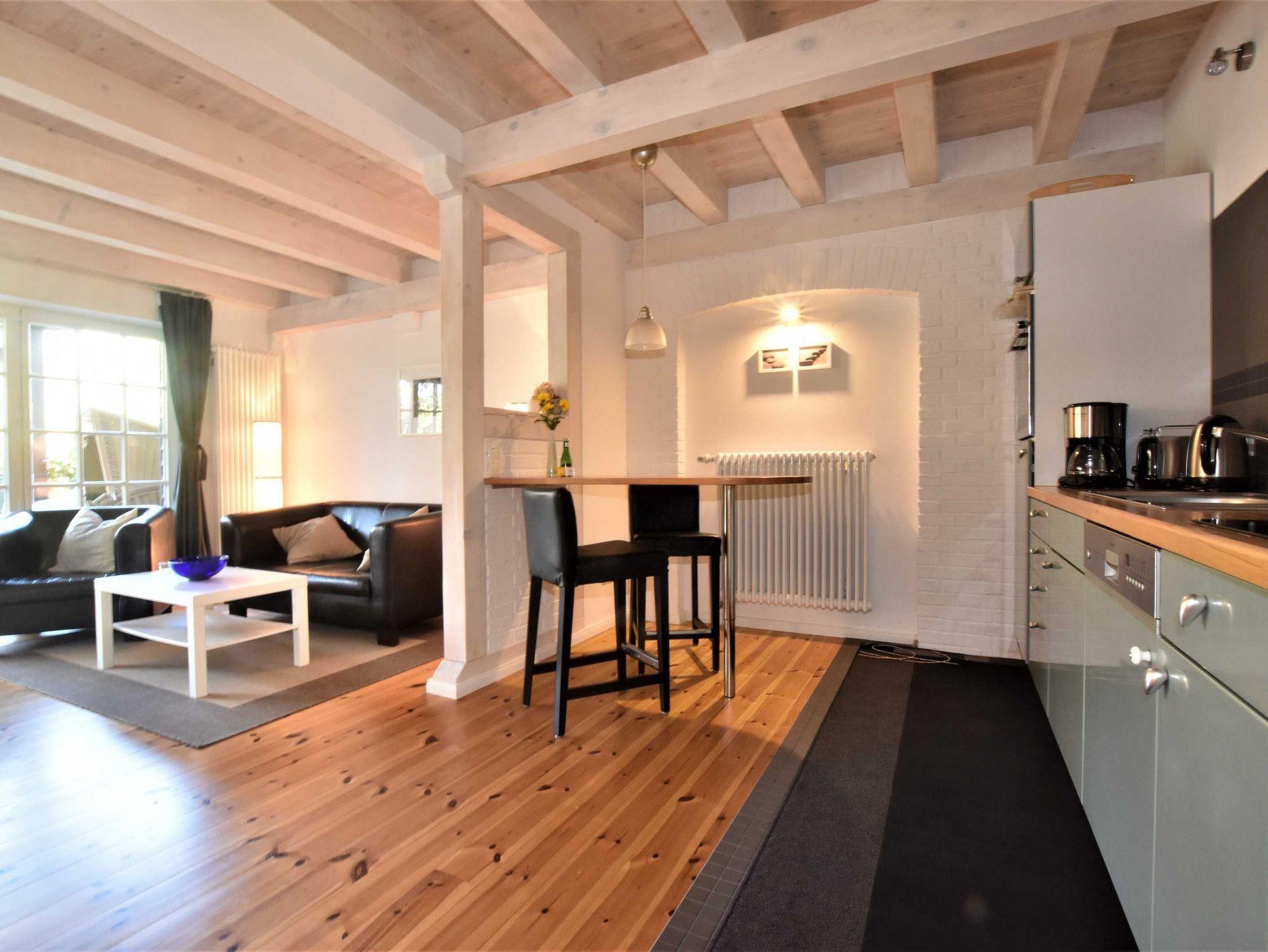 Die Wohnung verfügt über eine umfangreich ausgestattete Küche mit 4- Platten- Herd, Backofen, Kühlschrank mit Gefriermöglichkeit, Kaffeemaschine, Toaster und Spülmaschine sowie einen Tresenbereich. Im angeschlossenen gemütlichen Wohnbereich gibt es eine eine Sitzecke mit TV und lauschigem Kamin. Schlafzimmer mit Doppelbett, Kleiderschrank und TV, Bad mit Du/WC.