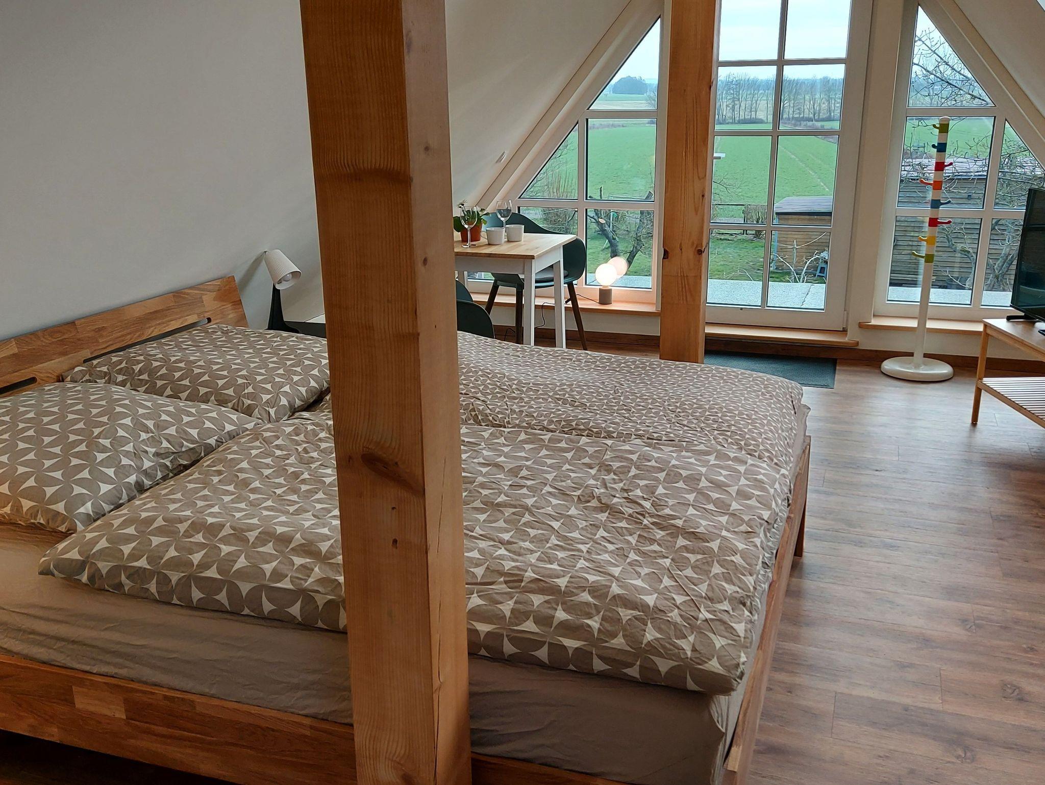 Liebevoll eingerichtete 1- und 2-Raum-Ferienwohnungen im Obergeschoss der modernisierten Scheune bieten nicht nur modernen Komfort, sondern auch einen schönen Wiesenblick. Die Möglichkeit, auf der Loggia, dem Balkon oder der Hofterrasse zu entspannen, rundet das Urlaubstag perfekt ab.