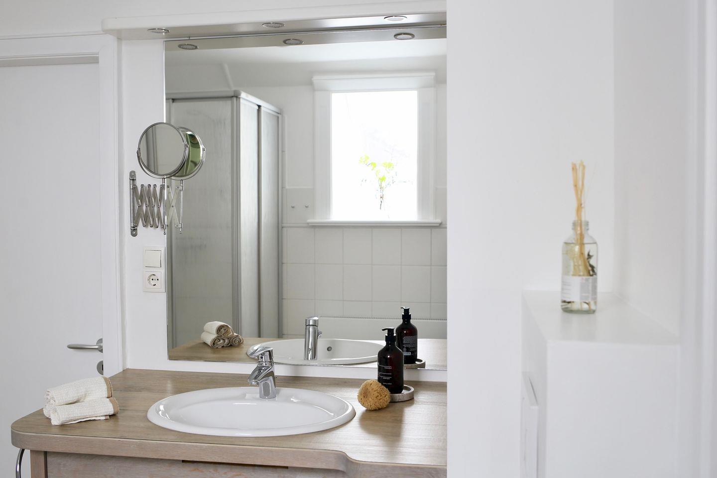° Badezimmer mit Dusche, Waschtisch, Föhn und Kosmetikspiegel