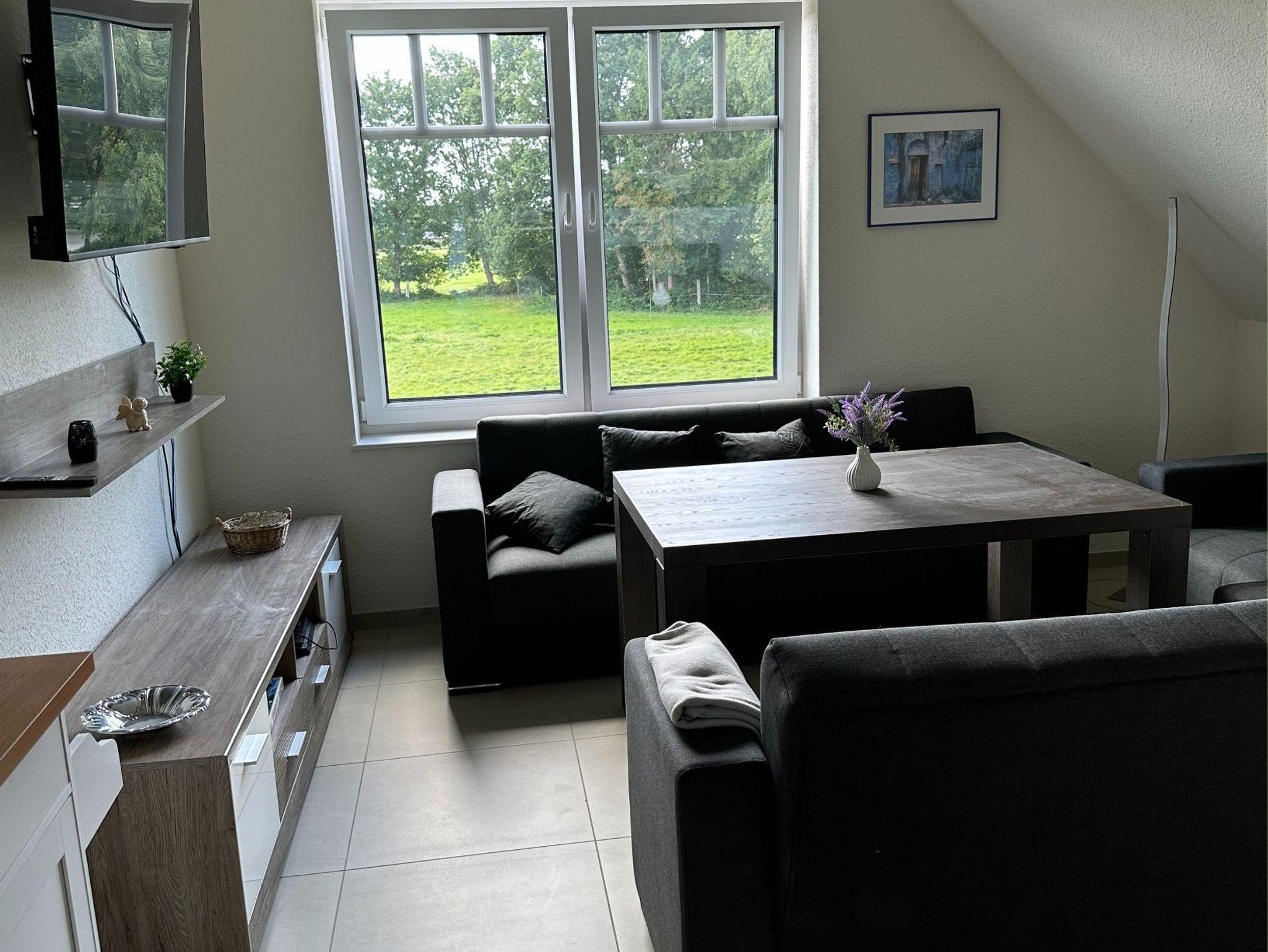 Die neu gebaute Ferienwohnung liegt im Obergeschoss und verfügt über eine gemütliche Wohnküche mit einem schönen Blick in die Natur. Die Wohnküche bietet eine zusätzliche Schlafmöglichkeit durch eine Couch, zwei gemütliche Doppelzimmer (1 Boxspringbett 1,80m x 2,00m und 1 Doppelbett 1,40m x 2,00m) sowie ein Bad mit einer Badewanne zum Entspannen und einer ebenerdigen Dusche. Eine Sitzecke im Garten steht Ihnen zur Verfügung.