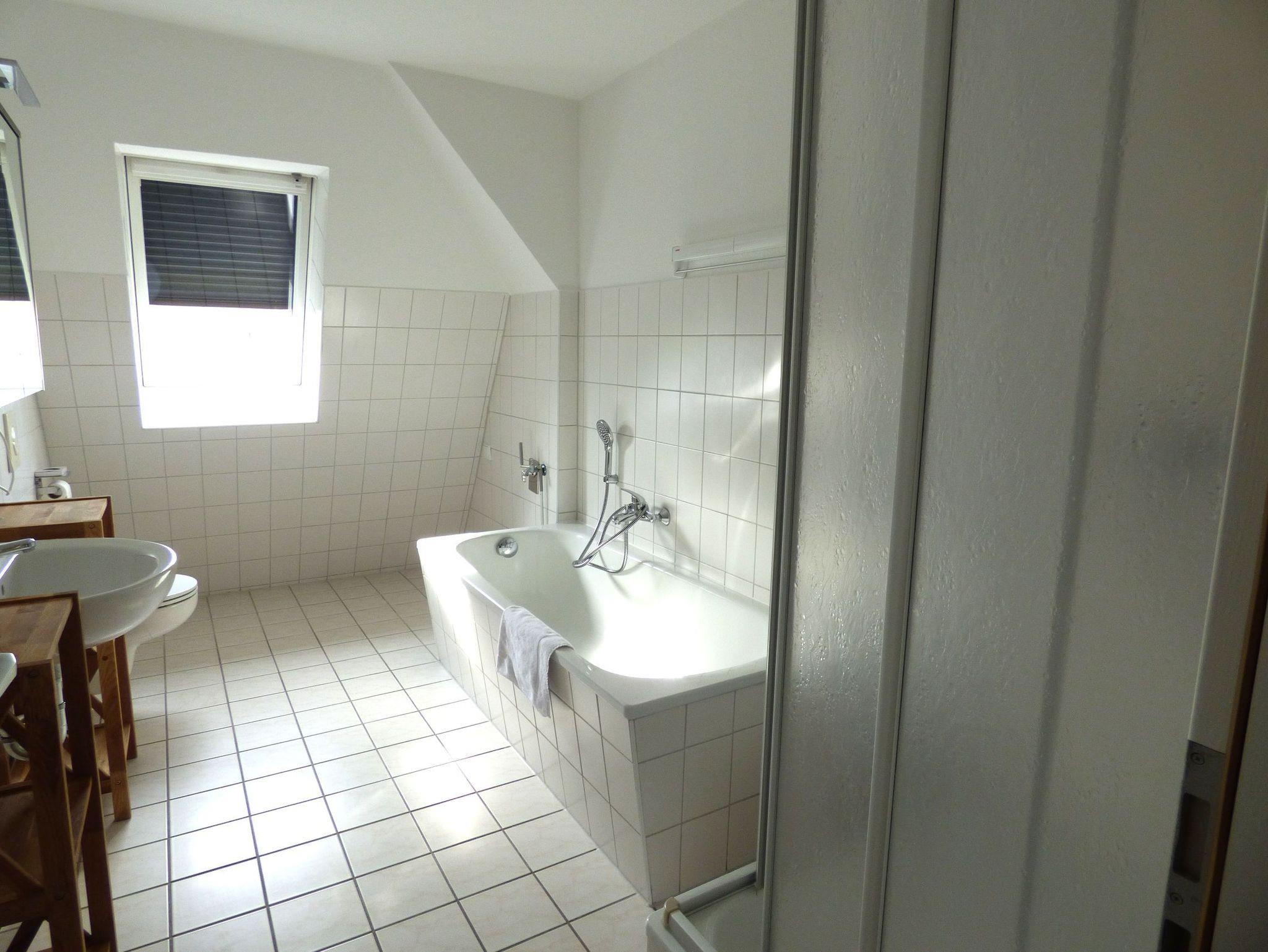 Das Bad ist mit Dusche, Waschbecken, WC und Handtuchtrockner ausgestattet, Kosmetikspiegel beleuchtet, Föhn und Handtuchtrockner gehören dazu.