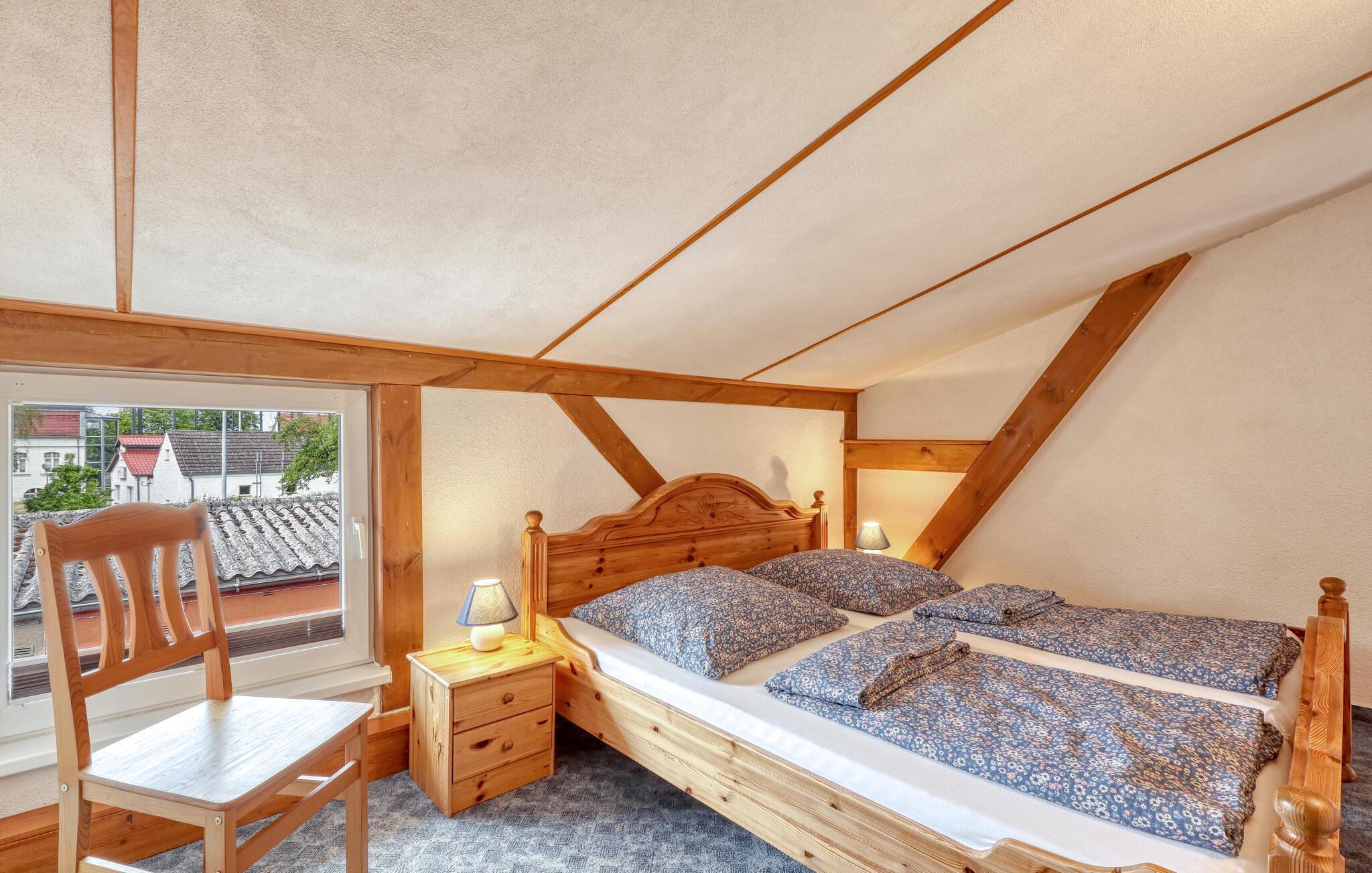 Den rymliga semesterlägenheten ligger separat på övervåningen (nås via en trappa) i ett uthus på en bostads- och affärsfastighet i ett centralt läge. Centrum med turistinformation, restauranger, affärer och cykelvägar ligger inom en radie av 500 m och kan därför lätt nås till fots. Boddentherme, en fritidsbassäng med wellnessfaciliteter, ligger bara ca 200 meter bort. Vattenskidcenter 1,5 km. Semesterlägenheten är utrustad med ett stort vardagsrum (stoppade möbler med sovfunktion, sittgrupp, matvrå, TV, radio), 2 sovrum (1 x dubbelsäng, 1 x 2 enkelsängar, barnsäng), kokvrå i öppen planlösning (elektrisk spis med ugn, kylskåp, bänkskiva, matbord, diverse köksmaskiner), badrum med dusch/toalett på bottenvåningen via trappa, insektsnät, centralvärme. Det finns en sittgrupp utomhus, en cykelkällare och en grill till ditt förfogande. I det totala priset ingår WLAN, vatten, energi och slutstädning. Sängkläder och handdukar kan tas med eller hyras på plats. Ribnitz är föremål för besöksskatt. Husdjur är tillåtna: En liten hund upp till en storlek av 40 cm är tillåten i detta boende.
