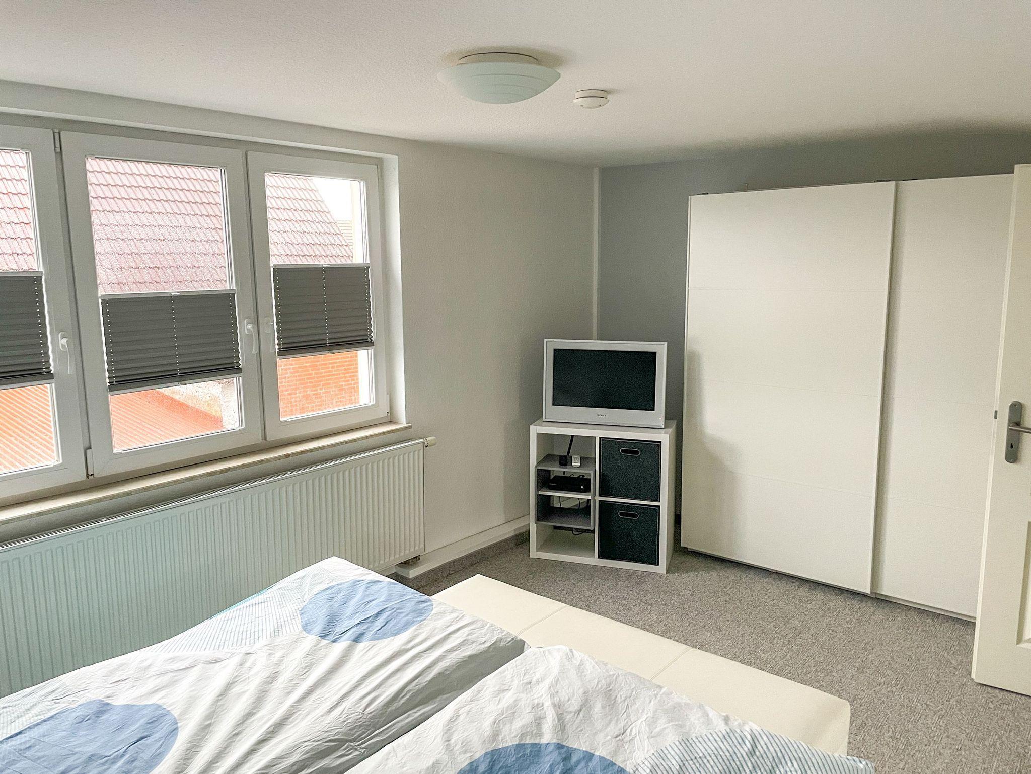 Die 50 m² große Ferienwohnung Ehling bietet einen gemütlichen Aufenthalt für 4 Personen. Sie befindet sich im Dachgeschoss eines Einfamilienhauses und hat einen separaten Eingang, welcher dich zunächst in einen kleinen Flur mit Garderobe führt. Über eine Treppe erreichst du dann die anderen Zimmer der Ferienwohnung. Der Wohnbereich mit offener Küche ist einladend gestaltet und bietet dir ein Schlafsofa (180x220), sowie einen TV für entspannte Abende. Die offene Küche ist praktisch ausgestattet mit zwei Herdplatten, einem Minibackofen für kleine Gerichte wie Brötchen oder Pizza, einem Kühlschrank mit Gefrierfach, einer Kaffeemaschine, einem Wasserkocher und einem Toaster. Am Esstisch kannst du deine Mahlzeiten genießen. Das separate Schlafzimmer verfügt über ein Doppelbett (180x200), einen Kleiderschrank mit ausreichend Stauraum und einen TV, sodass du auch hier deine Lieblingsserie schauen kannst. Das Bad ist mit einer Dusche und einem WC ausgestattet.