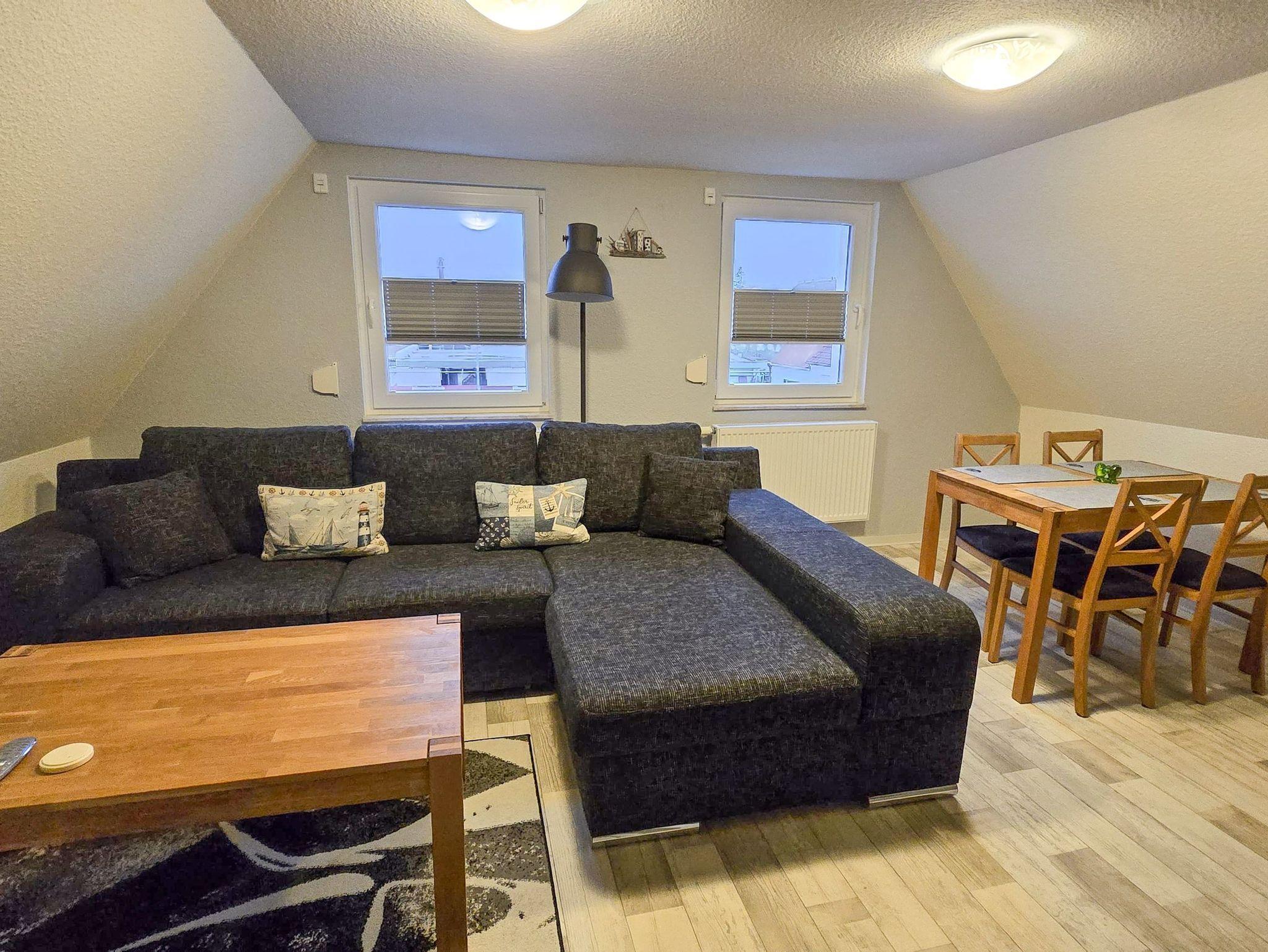 Die Ferienwohnung Ehling in Ribnitz-Damgarten ist mit ihren 50 m² ein gemütlicher Rückzugsort für 4 Personen. Sie befindet sich im Dachgeschoss eines Einfamilienhauses und bietet dir durch den separaten Eingang Privatsphäre und Unabhängigkeit. Die Wohnung liegt in einer ruhigen Siedlung, ideal für erholsame Tage mit Familie oder Freunden. Der Wohnbereich ist gemütlich gestaltet und verfügt über ein Schlafsofa und eine offene Küche mit Esstisch. Das Schlafzimmer mit Doppelbett lädt zu erholsamen Nächten ein und im Bad erwartet dich eine Dusche. Der kleine Flur mit Garderobe sorgt für praktischen Stauraum. Zusätzlich stehen dir ein Parkplatz direkt auf dem Hof, eine Fahrradunterstellmöglichkeit und WLAN zur Verfügung. Bitte bringe deine eigenen Handtücher mit.