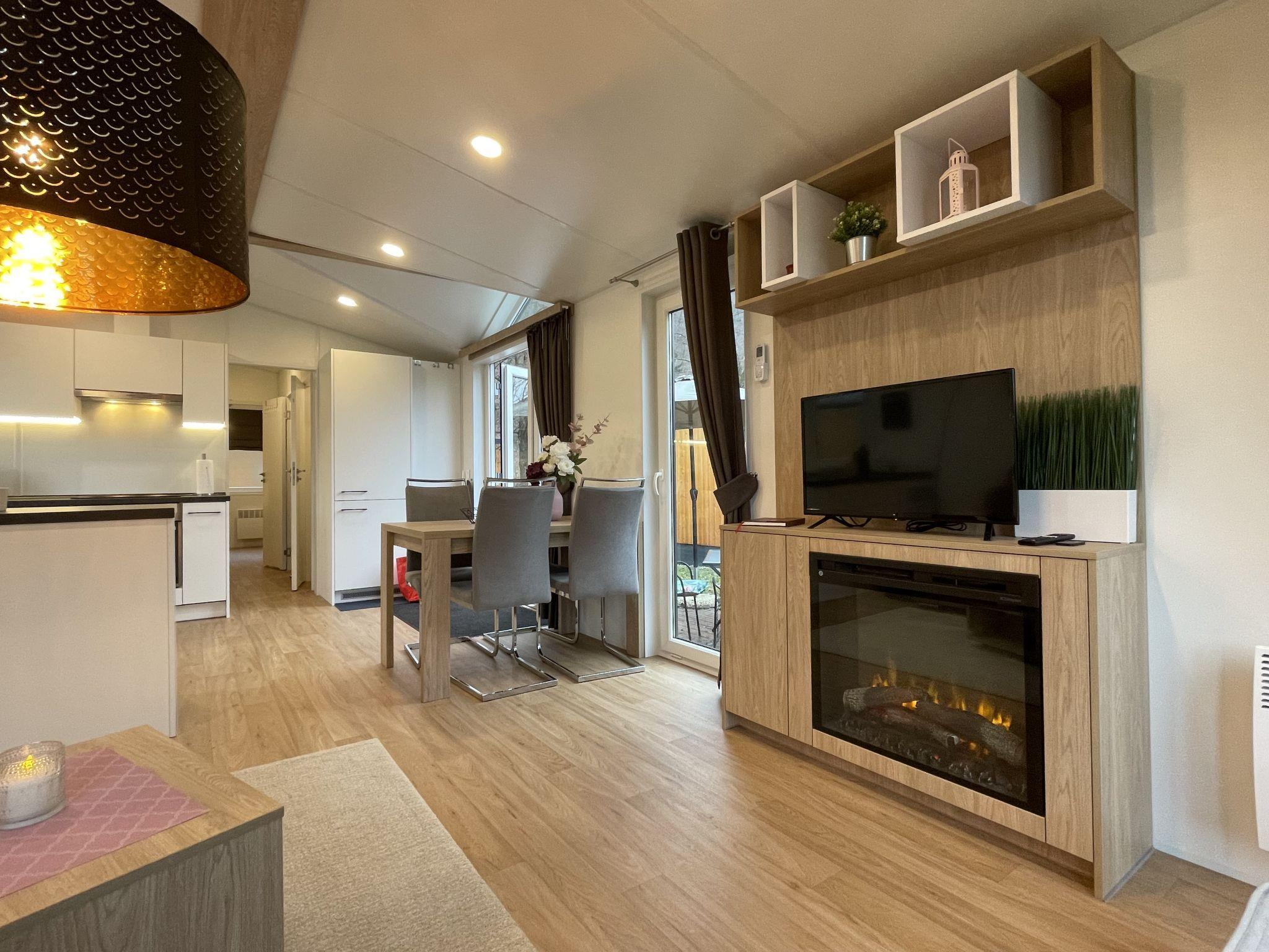 "Tiny Haus Raabennest", 3-room mobile home 48 m2, on the ground floor. Object suitable for 4 adults + 2 children. Comfortable furnishings: living/sleeping room with 1 double sofabed (160 cm, length 200 cm), Scandinavian wood stove (only for decoration), dining table and satellite TV (flat screen), air conditioning. Exit to the terrace. 1 room with 1 french bed (160 cm, length 200 cm). 1 room with 2 beds (80 cm, length 200 cm). Open kitchen (oven, dishwasher, 4 ceramic glass hob hotplates, kettle, freezer, electric coffee machine). Shower, sep. WC. Electric heating. Small terrace. Terrace furniture. Facilities: washing machine, dryer. Internet (WiFi, free). Parking (1 car) at the house. Please note: suitable for families. Non-smoking house. Smoke alarm.