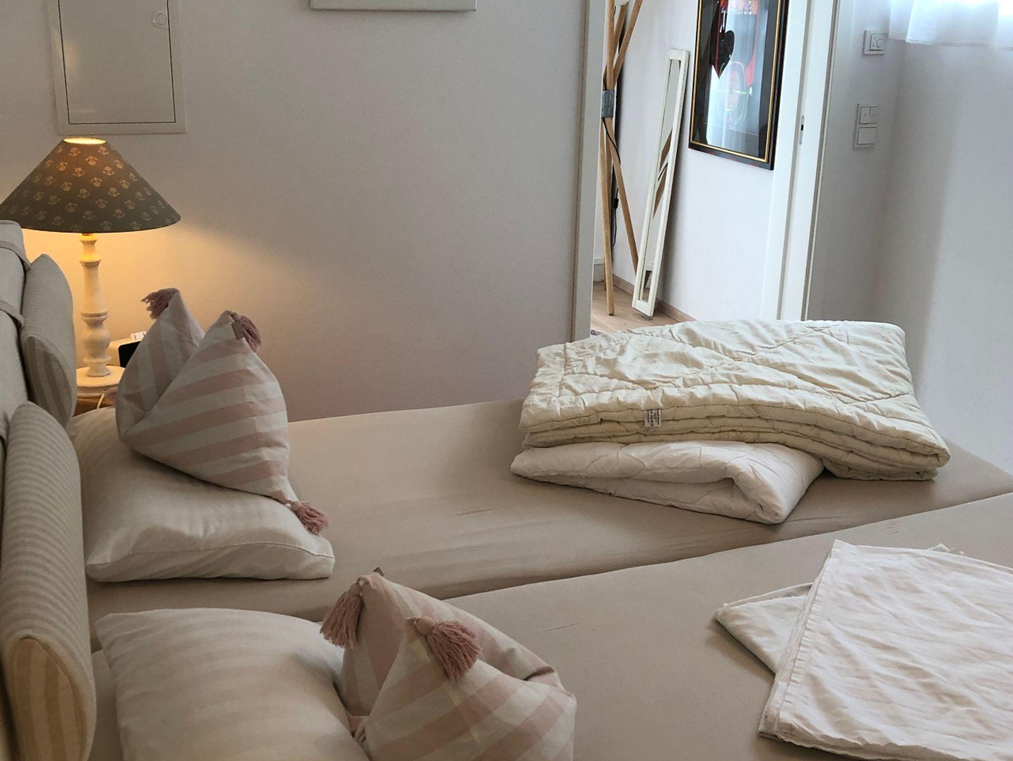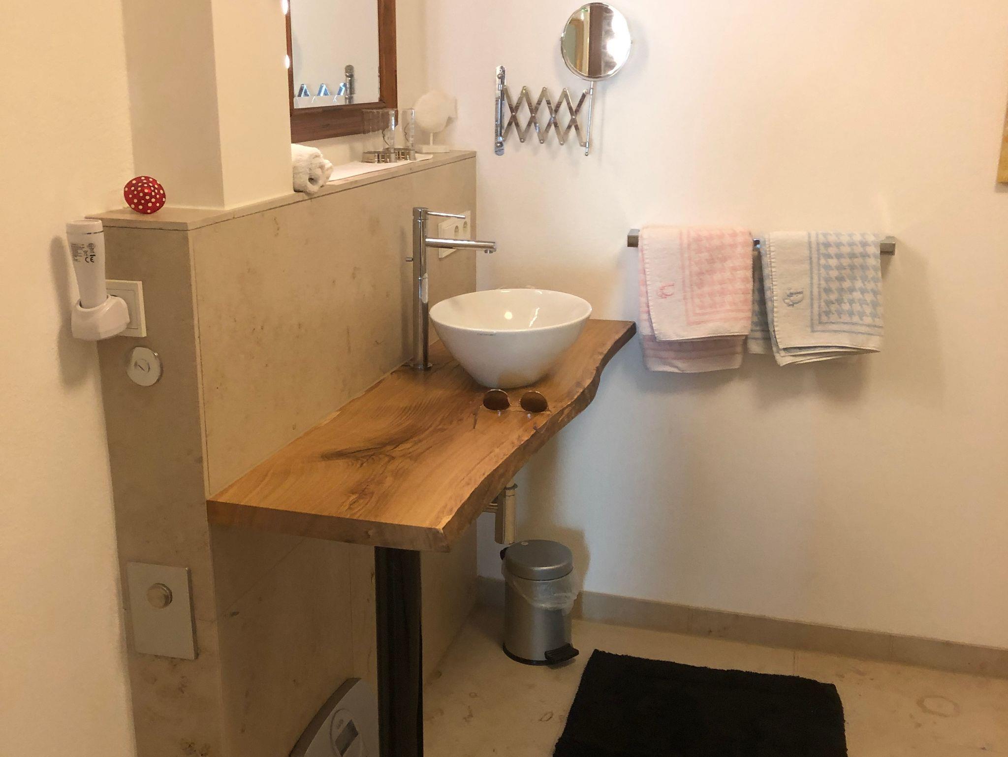 Das Schlafzimmer ist hell und ruhig. Getrennt durch eine Türe befindet sich das geschmackvoll eingerichtete Badezimmer mit geräumiger bodengleicher Dusche.