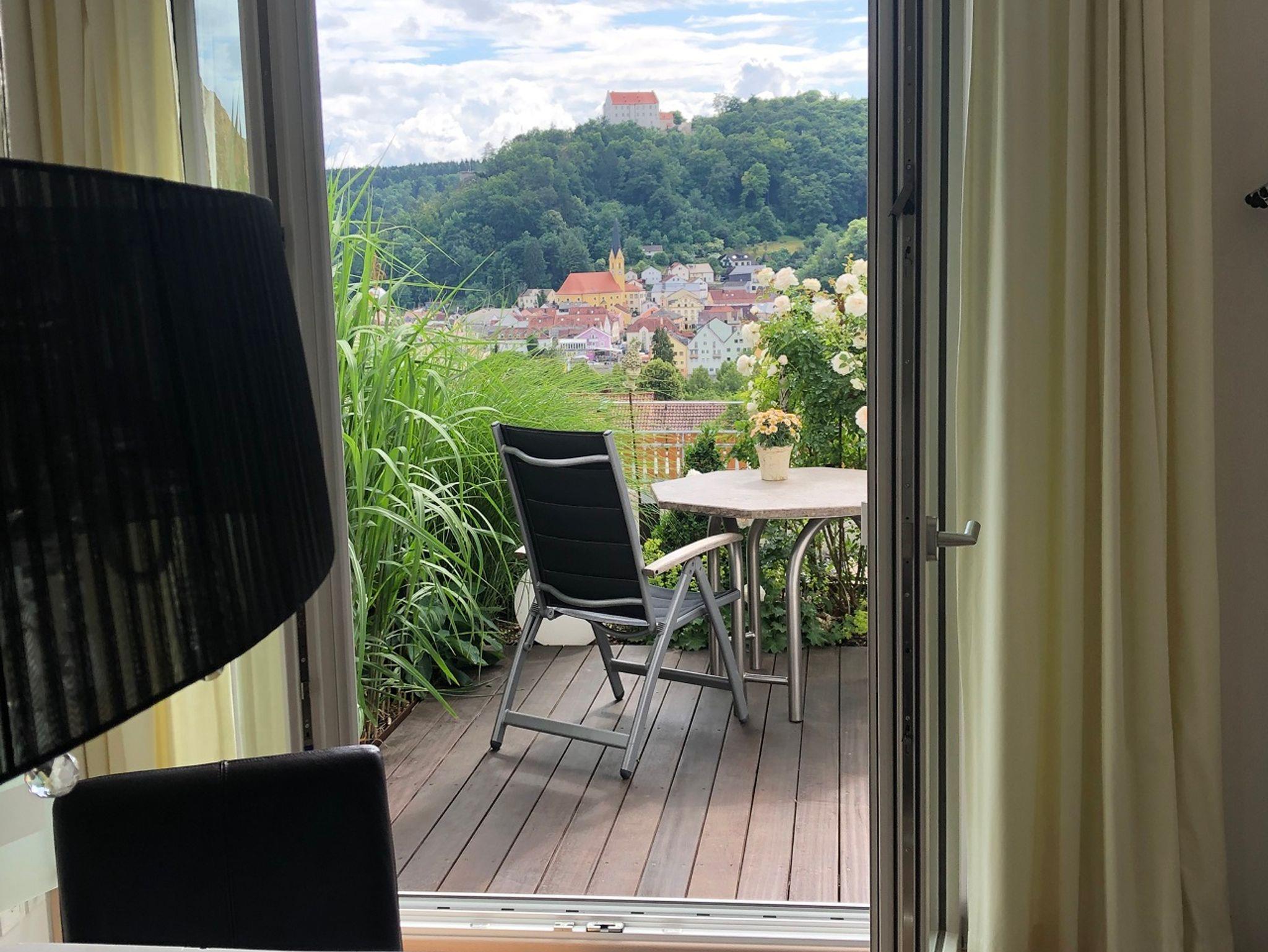 Es steht Ihnen eine möblierte Holzterrasse mit fantastischem Blick auf Riedenburg zur Verfügung.