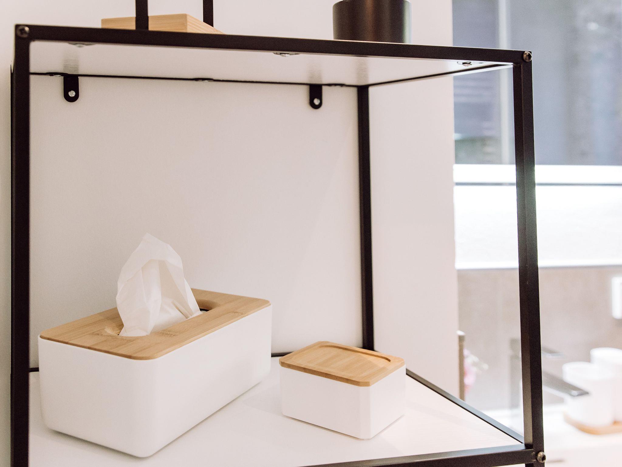 Das moderne Badezimmer verfügt über eine komfortable Dusche, stilvolle Amaturen und helle, freundliche Materialien.