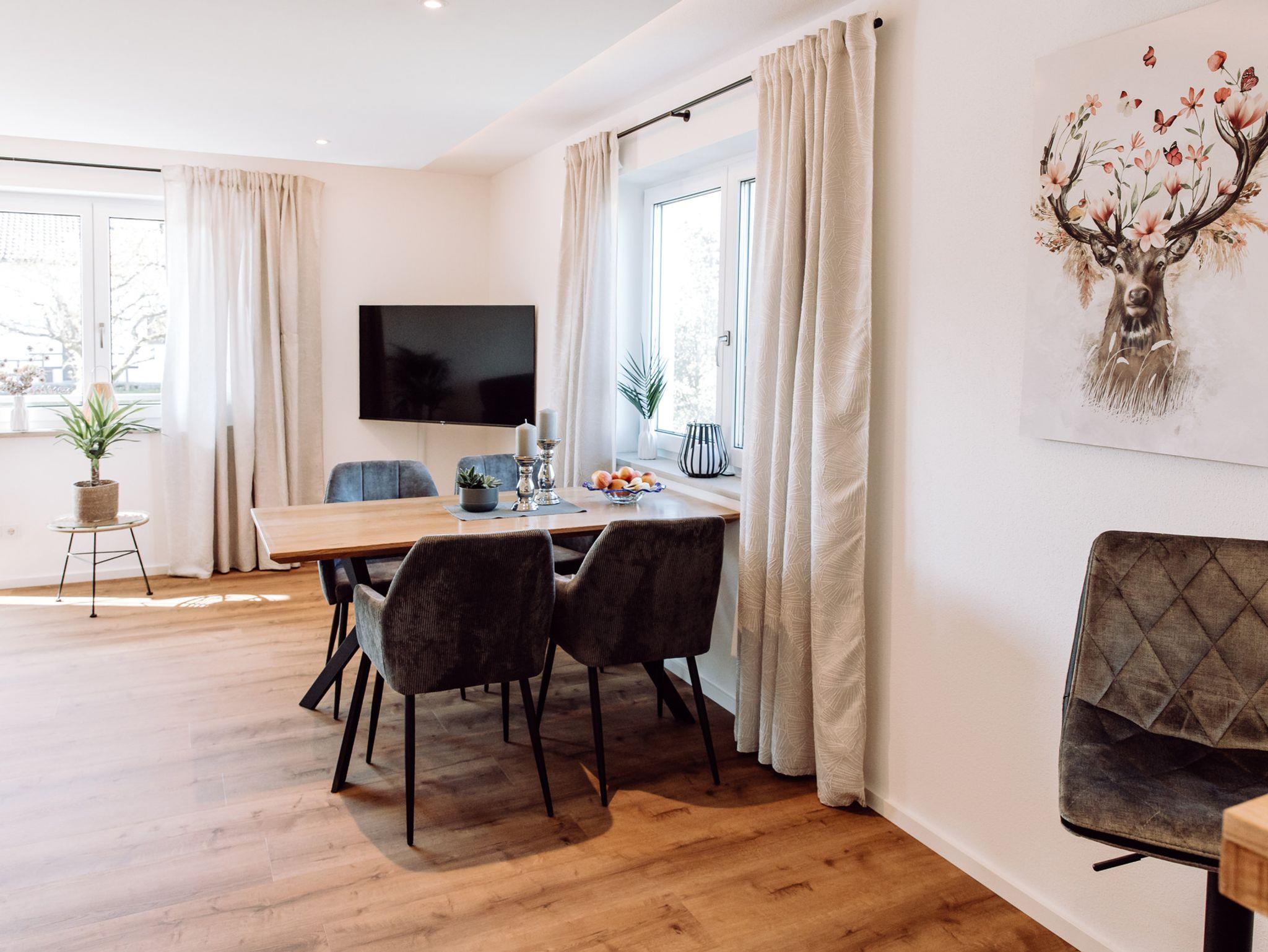 Der angrenzende Essbereich ist harmonisch integriert und lädt zum gemeinsamen Essen und Genießen ein.