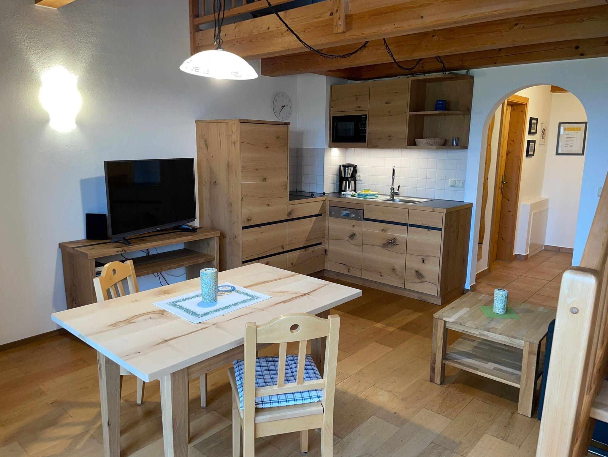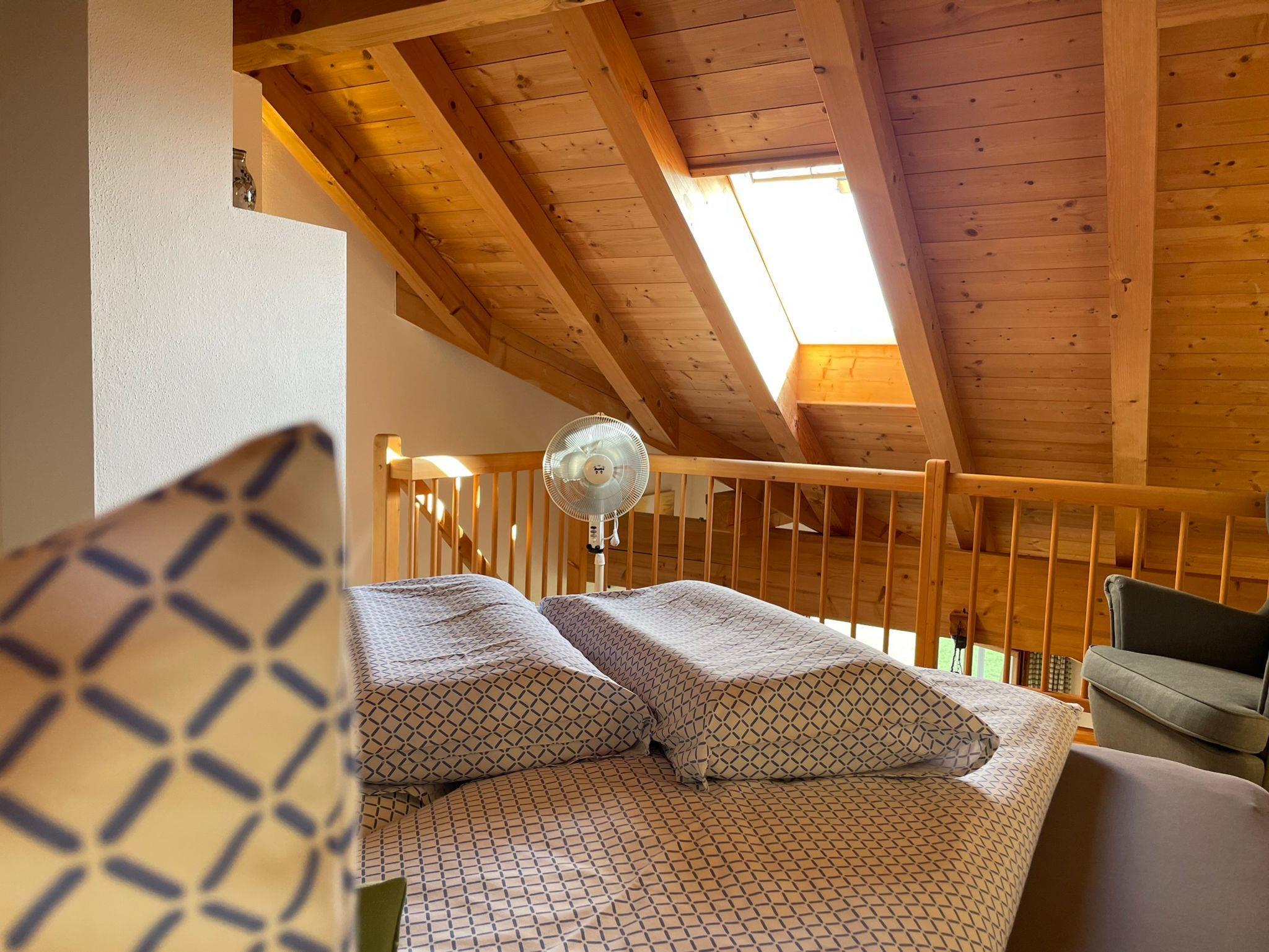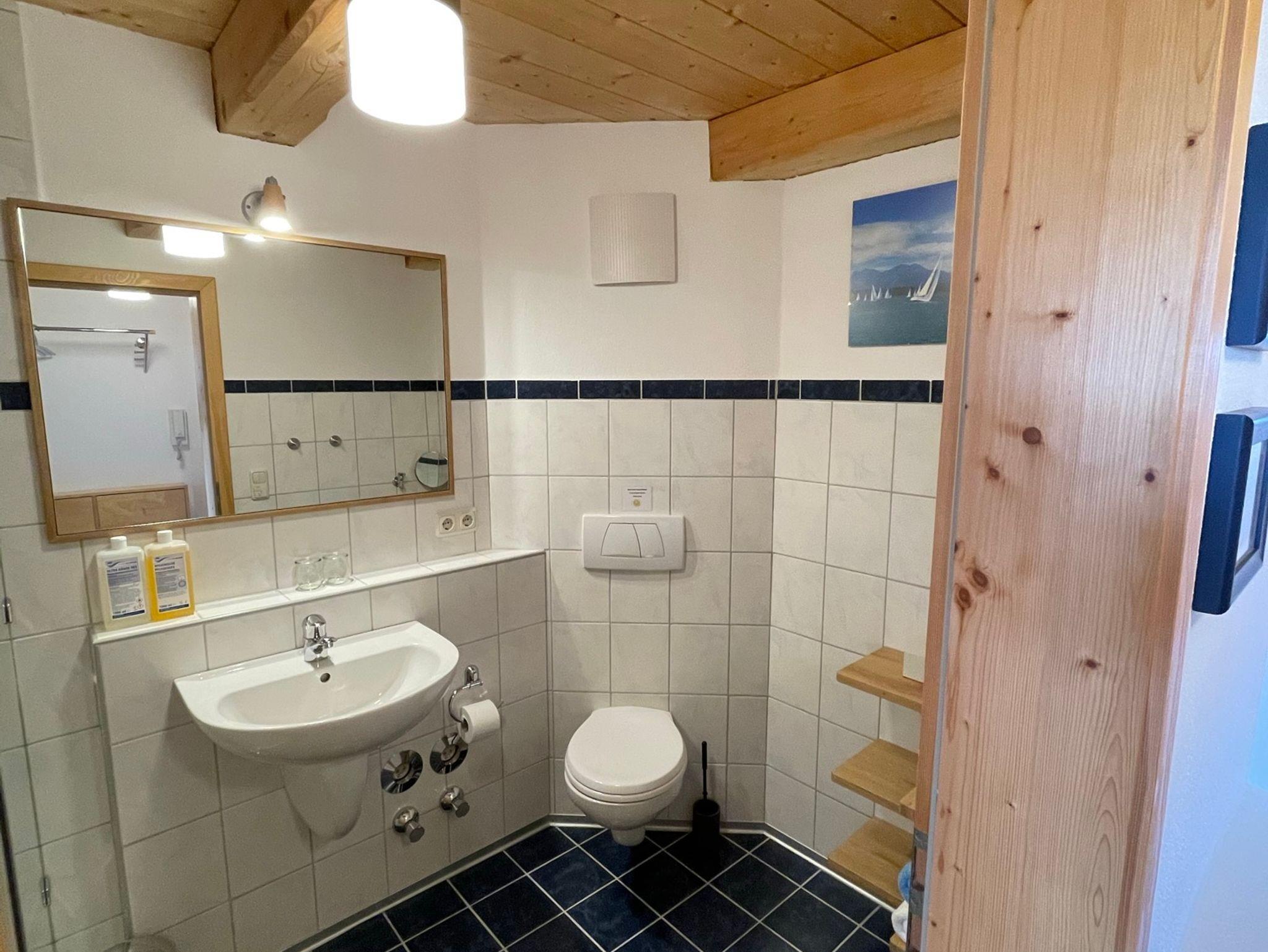 Die etwa 36 qm große Ferienwohnung ist durch eine Schlafgalerie räumlich getrennt und befindet sich im 2. Stock des See Cafe Toni, ein einzelstehendes Landhaus am Nordufer des Chiemsees mit Blick über die Schafwaschener Bucht und die Chiemgauer Alpenkette.