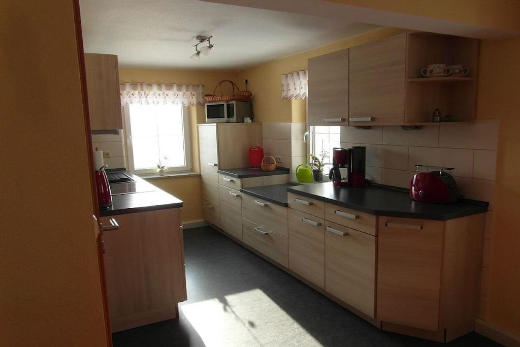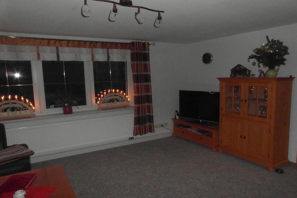 Lägenhet 2 i semesterhuset "Am Waldweg" ligger på första våningen. Denna rökfria lägenhet på 75 m² rymmer upp till 5 personer och 1 spädbarn och har ett fullt utrustat kök med diskmaskin och mikrovågsugn. Vardagsrummet är bekvämt möblerat med öppen spis, och det stora fönstret erbjuder en magnifik utsikt över Rittersgrün-dalen. Lägenheten har två sovrum, ett badrum och en separat toalett. Barnfamiljer är mycket välkomna. Utomhus finns en mysig sittgrupp med grill och eldstad. Den stora tomten erbjuder gott om plats för barn att leka. Vi har också tänkt på våra yngre gäster med en gunga och en sandlåda.