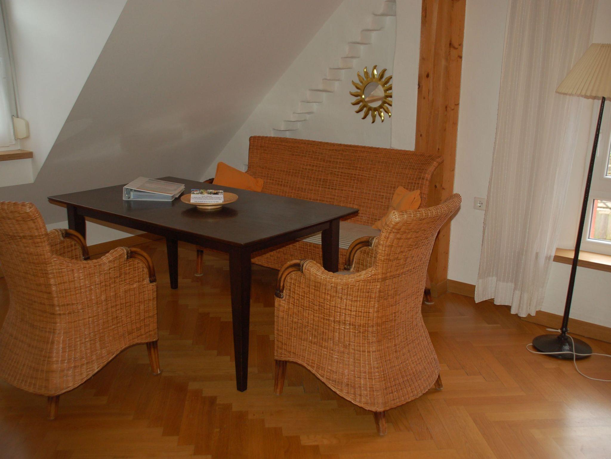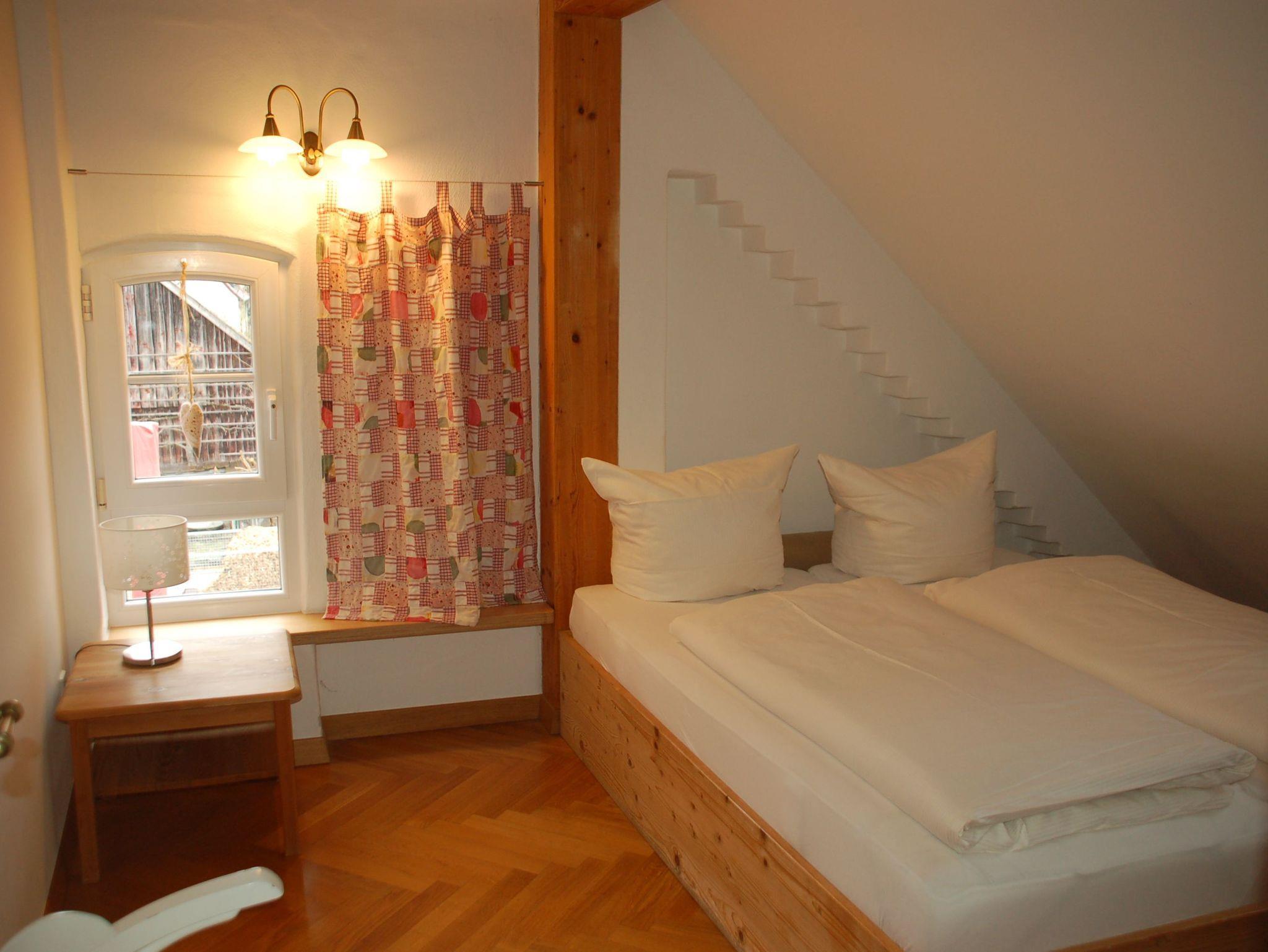 Im Dachgeschoss des ehemaligen Wohnhauses der Müllers-Leute befindet sich die beliebte Wohnung Sonnenschein. Echtholzparkett, das offene Dachgebälk und die individuelle Ausstattung machen den besonderen Charme dieser Wohnung aus! Das Badezimmer verfügt über Dusche, WC und Waschtisch. Im gemütlichen Wohn-/Essbereich wurde die vollaustetattete Küche mit historischen Fliesen aus der ulmer Region (um 1900) aufgewertet. Eine Holztreppe führt nach auf die offene Galerie zur Kuschelhöhle im Dachspitz. Hier sind zwei Betten für Kinder (je 200 x 90 cm) untergebracht. Im Elternschlafzimmer befindet sich ein 160 cm breites Doppelbett.