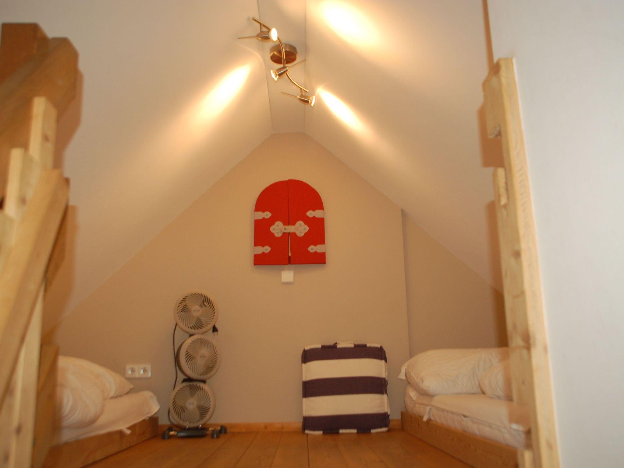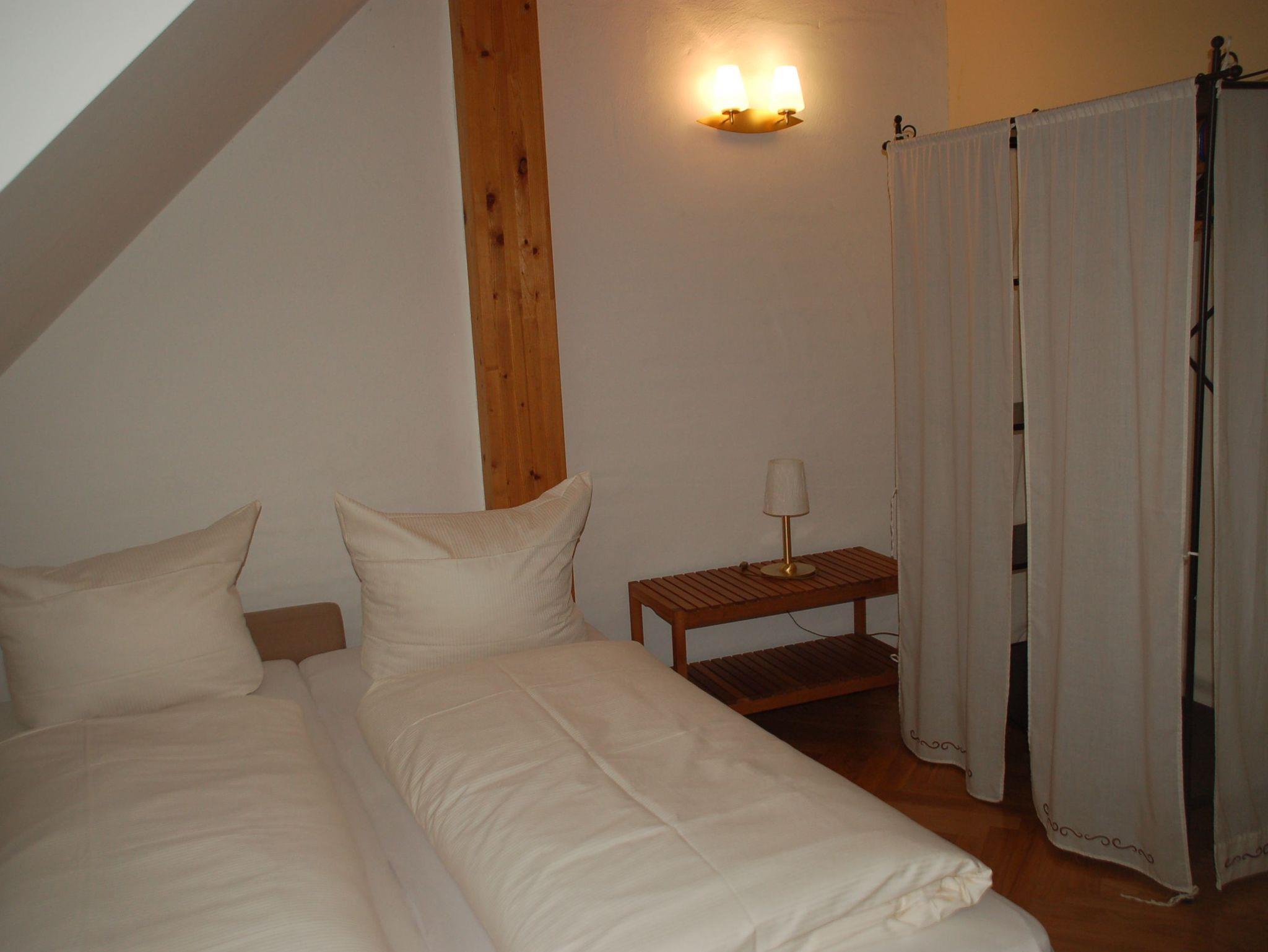 Im Dachgeschoss des ehemaligen Wohnhauses der Müllers-Leute befindet sich die Wohnung Storchennest. Echtholzparkett, das offene Dachgebälk und die individuelle Ausstattung machen den besonderen Charme dieser Wohnung aus! Das Badezimmer verfügt über Dusche, WC und Waschtisch. Im gemütlichen Wohn-/Essbereich wurde die vollaustetattete Küche mit historischen Fliesen aus der ulmer Region (um 1900) aufgewertet. Eine Holztreppe führt nach auf die offene Galerie zur Kuschelhöhle im Dachspitz. Hier sind zwei Betten für Kinder (je 200 x 90 cm) untergebracht. Im Elternschlafzimmer befindet sich ein 160 cm breites Doppelbett.