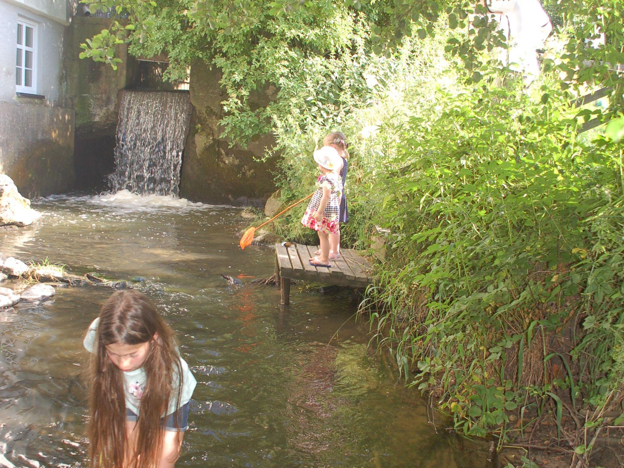 Auf unserem Gelände gibt es viel zu entdecken. Spielplätze zum Springen, Klettern und Schaukeln, die Geisterhöhle, Wasserspielplatz sowie den Bach direkt am Gelände, der an heißen Tagen Abkühlung bietet.