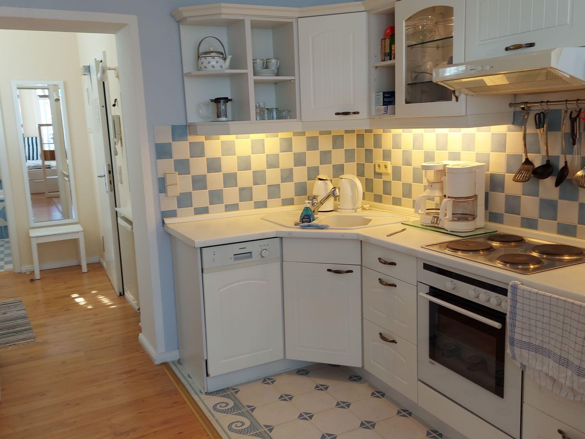 Die 1-Zimmerwohnung liegt im 1. Obergeschoss und verfügt über einen Balkon mit Blick auf den Alten Strom. Der Wohn- und Schlafbereich ist in eine Sofaecke mit Flachbild-TV und Esstisch, ein Doppelbett und den Zugang zur Balkonterrasse unterteilt. Eine große schöne Einbauküche befindet sich ebenfalls im Wohn-Schlafraum und ist komplett ausgestattet mit Kaffeemaschine, Geschirrspüler und Kühlschrank mit TK-Funktion. Das Tageslichtbad ist mit einer großzügigen Wanne und einer Waschmaschine ausgestattet.